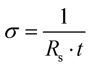 The sheet resistance of the films was measured in dry conditions at room temperature with the Van der Pauw (VDP) method using a Keithley 4200 with probe station MPI-TS200 (Tektronix Inc., USA) and a 4-probe setup using tungsten probes (Picoprobes ST-20-2). To facilitate the measurements, we fabricated specialised test structures to aid the contacting of the conductive polymer film. The test structures comprised metal pads (Ti/Au) contacting the edges of a 500 µm wide square of conductive polymer film. The structures were fabricated on a PaC-coated wafer with the process described earlier, and the conductive polymer squares were structured via dry etching. The conductivity of the films was estimated from the sheet resistance and the film thickness using eqn (5):