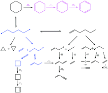 Thermal decomposition of cyclohexane at temperatures up to 1310 K was performed using flash pyrolysis coupled with vacuum ultraviolet (118.2 nm) photoionization time-of-flight mass spectrometry. The experimental results revealed that the major initiation reaction of cyclohexane decomposition was C–C bond fission leading to the formation of 1,6-hexyl diradical. The 1,6-hexyl diradical could isomerize to 1-hexene and decompose into ˙C3H7 + ˙C3H5 and ˙C4H7 + ˙C2H5. The 1,6-hexyl diradical could also undergo direct dissociation; the C4H8 fragment via the 1,4-butyl diradical intermediate was observed, serving as evidence of the 1,6-hexyl diradical mechanism. Quantum chemistry calculations at UCCSD(T)/cc-pVDZ level of theory on the initial reaction pathways of cyclohexane were performed and found to be consistent with the experimental conclusions. Cyclohexyl radical was not observed as an initial intermediate in the pyrolysis. Benzene was produced from sequential H2 eliminations of cyclohexane at high temperatures.