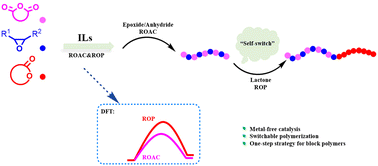 It is particularly important to be able to synthesize well-defined block copolymers from one-pot monomer mixtures in a metal-free manner. Herein, switchable copolymerization between the ring-opening alternating copolymerization (ROAC) of anhydrides with epoxides and the ring-opening polymerization (ROP) of lactones using imidazolium ionic liquids has been investigated in detail. It is found that a simple ionic liquid, 1-ethyl-3-methylimidazole chlorine (EMIMCl), was efficient to bridge ROAC and ROP, producing well-defined block polyesters from anhydrides, epoxides and lactones in a one-step strategy. The DFT calculation and experimental results indicated that the sequential transformation of mixed monomers mainly depends on the synergistic effect of anions and cations of ionic liquids, where the generating alkoxide anions are the key to regulate ROAC and ROP, and imidazolium cations (EMIM+) contribute to the monomer activation and inhibition of potential side reactions. EMIMCl exhibits high catalytic activity and selectivity in a multi-component system, which enables the switchable copolymerization of mixed monomers from ROAC to ROP. This study provides a new route for the facile synthesis of block polyesters using a metal-free catalytic system.