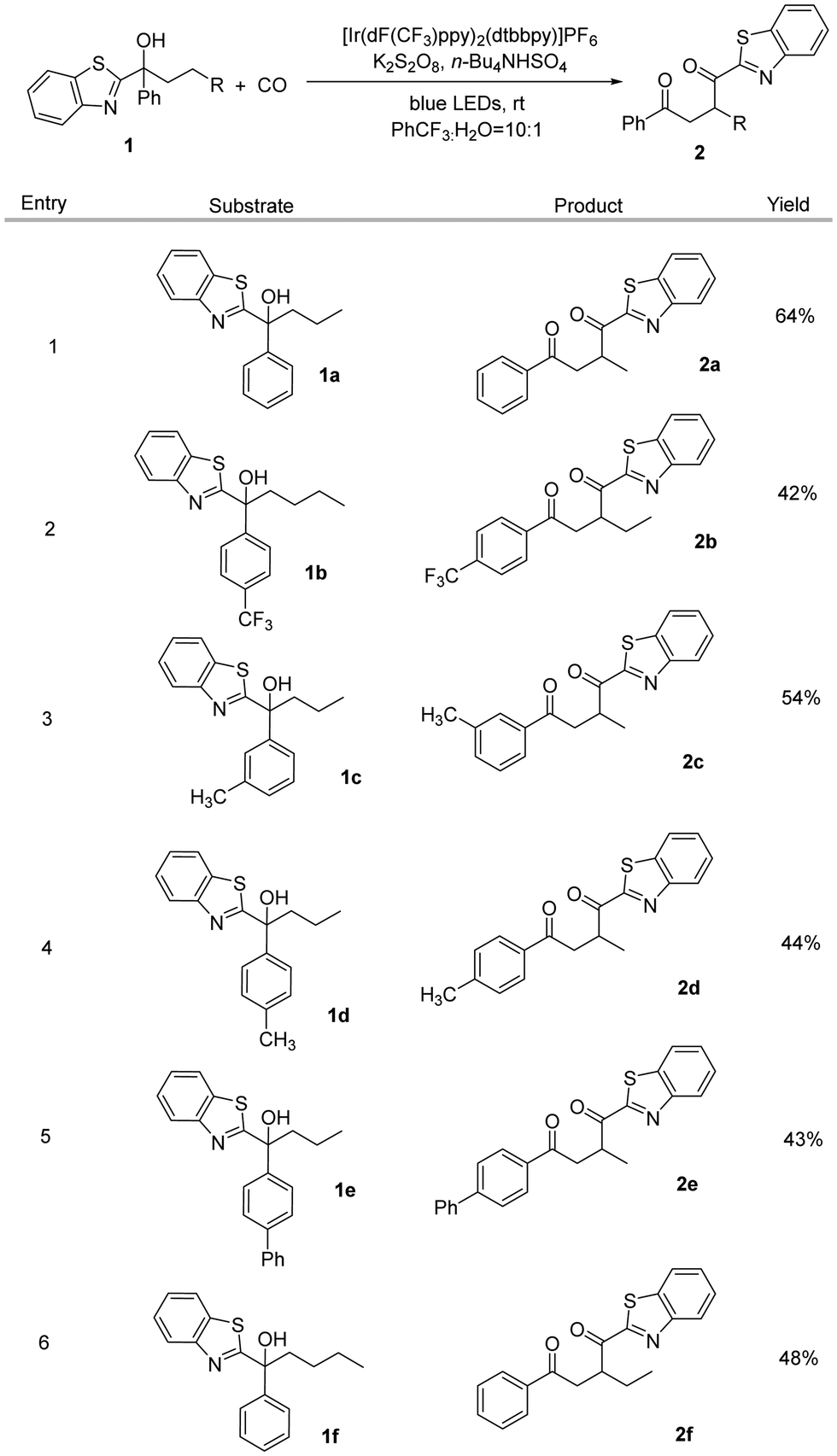 We synthesized a tertiary alcohol containing butyl and benzothiazole groups (1f) as the model substrate for optimizing this migration reaction. Blue LEDs were chosen as the light source and high oxidation potential [Ir(dF(CF3)ppy)2(dtbbpy)]PF6 as the photocatalyst. A persulfate-type oxidant is essential and cannot be substituted by using PIDA, and we finally chose K2S2O8 as the oxidant (Table 1, entries 4 and 5). Here, the compatibility between the photocatalyst and oxidant could be an explanation for this result. The introduction of alternative phase transfer catalysts did not supersede the efficacy of n-Bu4NHSO4 (Table 1, entries 6 and 7), which is postulated to be the optimal phase transfer catalyst for this reaction. After comparing several solvents, PhCF3 was identified as the most suitable option here (Table 1, entry 8). This might benefit from the weak interaction between the fluorine atom and proton of the OH group in the substrate. The addition of a small quantity of water is essential for the dissolution of the persulfate (Table 1, entry 9). Furthermore, no product was formed in the absence of light (Table 1, entry 10).