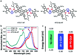 Two ultra-narrow bandgap non-fullerene acceptors (NFAs), 4TO-T-4F and 4TO-Se-4F, were designed and synthesized for application in organic solar cells (OSCs). Thiophene and selenophene were used as π-spacers to extend the effective conjugated length via intramolecular noncovalent O⋯S or O⋯Se interactions and lower the bandgap. Both NFAs, 4TO-T-4F and 4TO-Se-4F, showed strong absorbance in the range of 700–1000 nm in the near-infrared region with an ultra-narrow bandgap of ∼1.30 and ∼1.27 eV, respectively. Using polymer PTB7-Th as the donor, which has complementary absorption and matched energy levels with these NFAs, the optimized device based on PTB7-Th:4TO-T-4F exhibited a PCE of 8.87%, with a low energy loss of 0.55 eV; and the PTB7-Th:4TO-Se-4F-based OSC device gave a PCE of 7.4%, with a low energy loss of 0.57 eV. Our results indicate that increasing the effective conjugate length of the molecular backbone, thus improving the electron-donating ability of the donor unit in NFAs via noncovalent O⋯S or O⋯Se interactions, is an efficient strategy to design and synthesize ultra-narrow bandgap NFAs for OSCs with low energy loss.