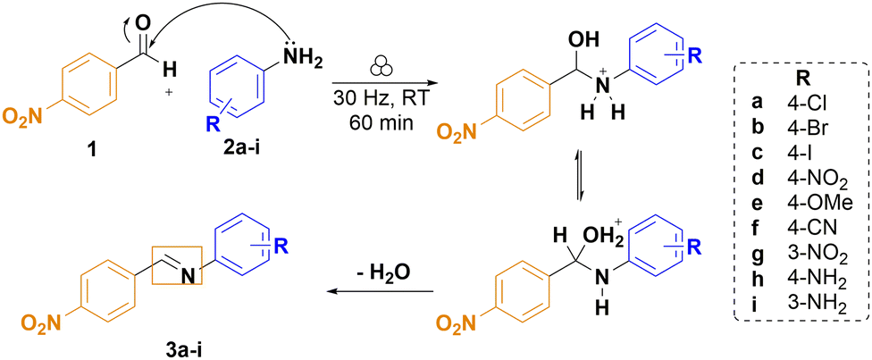 The reaction between the benzaldehyde and the aniline is a nucleophilic attack of the aniline amino group on the carbon atom of the aldehyde moiety followed by an elimination reaction leading to the formation of a C