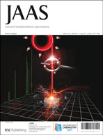 The different behaviours of dissolved silver and silver nanoparticles under ICP-MS single particle detection conditions have been used to differentiate directly between both forms of silver in aqueous samples. Suspensions containing silver nanoparticles at number concentrations below 109 L−1 and/or dissolved Ag(I) are introduced into the ICP-MS by conventional pneumatic nebulization and measured with a time resolution of 5 ms. Each silver nanoparticle is converted in the ICP into a packet of ions, which are detected as a single pulse, whose intensity is proportional to the number of silver atoms in the nanoparticle, whereas dissolved silver produces pulses of averaged constant intensity. The frequency plots with respect to the intensity measured for each pulse show independent distributions for dissolved silver and silver nanoparticles, whose profiles are also different (Poisson and lognormal, respectively). Size limits of detection for pure Ag nanoparticles of 18 nm, equivalent to a silver mass of 32 ag, were obtained. Number concentration limits of detection of 1 × 104 L−1 can be achieved. A methodological approach for identification, characterization and determination of mass and number concentration of dissolved Ag(I) and silver nanoparticles at environmentally relevant concentrations is presented.