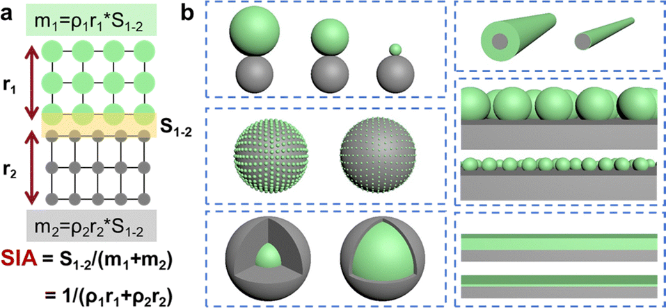 | Fig. 1 (a) Depiction of the specific interface area (SIA) and (b) schemes showing the various solid–solid contact modes with different specific interface areas. | ||