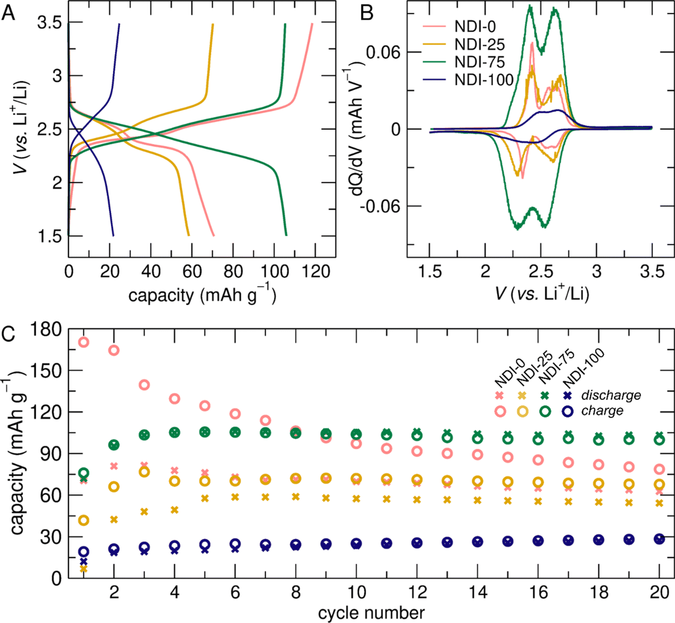 The relative definition of the two electrochemical processes occurring during cycling in the NDI-X electrodes is more pronounced when viewed as the differential capacity with respect to voltage (Fig. 3B and S10D†). For all of the prepared networks, regardless of cross-link density, some fraction of NDI redox-centers were doubly reduced and were electronically and ionically accessible (Fig. 1). Differential capacity plots of intermediate cross-linking densities (NDI-25 and NDI-75) showed two symmetric redox-events that were separated by 250 mV (at 2.55 V and 2.25 V vs. Li+/Li, respectively). In less cross-linked electrodes we observed features that were further separated (for NDI-0, 2.3 V and 2.6 V vs. Li+/Li) (Fig. 3B). For the differential capacity plot of NDI-100 we observed the opposite with redox features being closer together and less defined (Fig. 3B). With higher cross-linking density, the two processes became less distinct. Specifically, for NDI-100, the overpotential increased, indicating additional energy required for lithiation and delithiation (Fig. 3A). The increased hysteresis between the symmetric processes during discharge and charge for NDI-100 reflected that the overpotential was due to kinetic – rather than energetic – differences, most likely due to ionic transport limitations associated with high cross-linking density.