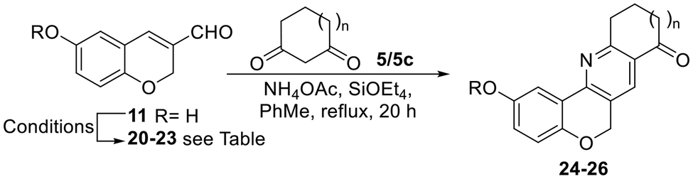 1 mixture of the product with the starting ketone, as per 1H NMR integration of the diagnostic H-2 signals (δ = 5.29, s, 1H). For this reason, the crude enamine preparation was used in the reaction with 3-formylchromene 12. When it was carried out in MeCN using FeCl3 as the promoter and oxidant,23 it afforded a single isolated product in 17% yield, after heating under microwave irradiation at 150 °C for 1 h (Table 1, entry 1).