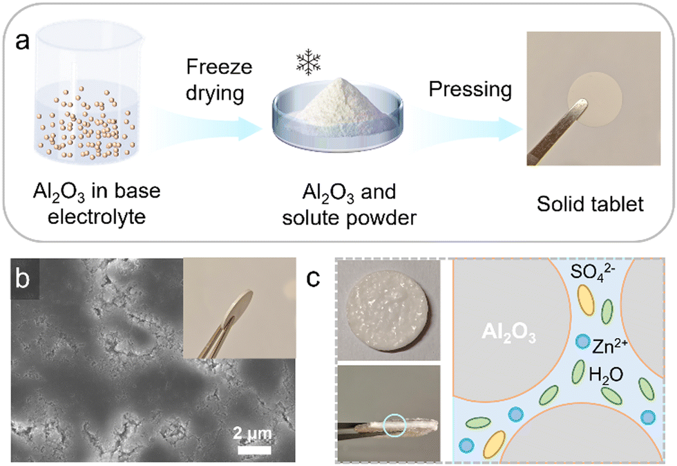 The LIAFE electrolytes are simple to prepare. The preparation begins with the formation of a solid Al2O3 tablet skeleton (Fig. 1a). Initially, the Al2O3 is evenly dispersed in the basis electrolyte (BE), which is a 2 M ZnSO4 solution for symmetric cells and half-cells, or 2 M ZnSO4 with additional 0.1 M MnSO4 for Zn/MnO2 full cells. Then, the mixture is rapidly frozen using liquid nitrogen and promptly transferred to a freeze-drying apparatus. After 48 hours of freeze-drying, the sample is removed and ground to obtain a powder of Al2O3 uniformly mixed with the solute. Finally, the powder is pressed into 13 mm diameter solid tablet under a pressure of 10 tons. The scanning electron microscope (SEM) image reveals that the solid-state tablet skeleton mainly consists of Al2O3 and solute powders, with uniformly distributed voids and gaps across the surface (Fig. 1b), allowing the basis electrolyte to evenly infiltrate through solid-state tablets. The inset in Fig. 1b provides a digital photograph showing the side view of a solid tablet. After the BE is applied to the surface of the tablet, it is allowed to infiltrate for ten minutes, which is long enough for it to fully infiltrate the voids within the solid skeleton, forming the LIAFE (Fig. S1, ESI†). The voids and gaps in the solid tablet act as channels for efficient transport of zinc ions after fully absorbing basis electrolytes (Fig. 1c). The cathodic linear sweep voltammetry (LSV) shows that LIAFE exhibits a higher onset potential compared to BE. Moreover, the response current of the cell using BE electrolyte is ten times greater than that of the cell using LIAFE electrolytes (Fig. S2, ESI†), indicating that LIAFE effectively inhibits the hydrogen evolution reaction (HER). These results demonstrate that LIAFE effectively mitigates side reactions at the electrode–electrolyte interface. This improvement is attributed to the presence of Al2O3, which reduces the number of water molecules in direct contact with zinc anodes, thereby minimizing undesirable reactions.