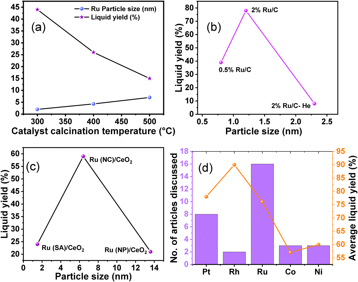 | Fig. 11 Effect of catalyst calcination temperature on particle size and liquid product yield (a); effect of particle size (b) and (c), and effect of metal (d) on liquid product yield. | ||