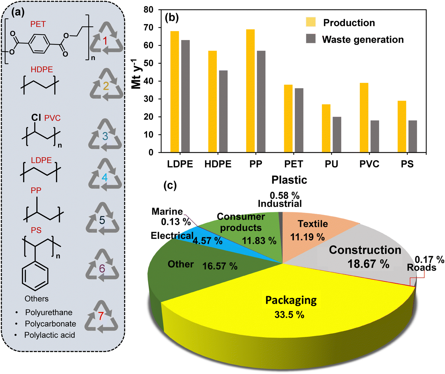 | Fig. 1 (a) Commonly employed plastics and (b) their annual production along with the amount of waste generated from the respective plastics in 2019. Data collected and reproduced with permission from ref. 7. Copyright 2020, Elsevier B.V. (c) The percentage consumption of plastics by various sectors in 2018. Data collected and reproduced with permission from ref. 6. Copyright 2021, Elsevier B.V. | ||