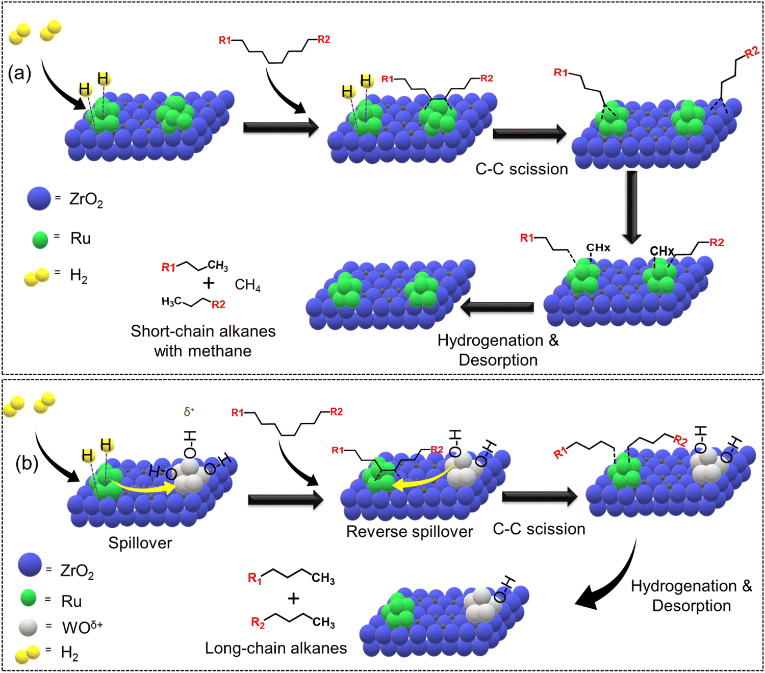 The addition of secondary metals could provide additional hydrogen through reverse spillover, thereby facilitating the rate-limiting hydrogenation/desorption processes on the active metal surface or at the interface and also altering the polymer–catalyst interactions, leading to enhanced catalytic activity and selectivity, and potentially changing the overall reaction mechanism. In this regard, Vlachos and co-workers incorporated WOx in Ru/ZrO2 and investigated the difference in the catalytic activity of Ru–Zr and tungstate zirconia-supported Ru (Ru–WZr) catalysts towards LDPE hydrogenolysis at 250 °C and 50 bar H2 for 2 h.54 Interestingly, the CH4 yield was ∼16% over the Ru–Zr catalyst and decreased to ∼7.5% and ∼4.9% over Ru–15WZr and Ru–25WZr catalysts, respectively. When moving from Ru–Zr to Ru–25WZr catalyst, the gasoline selectivity increased from 25% to 28%, jet fuel selectivity increased from 33% to 42%, diesel fuel selectivity increased from 47% to 66%, and the selectivity towards wax/lubricant based-oil increased from 22% to 35%. Such interesting trends demonstrate that the incorporation of WOx in the Ru–Zr catalyst decreased the formation of gaseous CH4 and increased the formation of value-added liquid hydrocarbons. The hydrogenolysis of LDPE over a supported Ru surface (Ru–Zr) is shown in Fig. 7(a) and (b). First, dehydrogenation of the polyethylene chain occurs on the Ru surface, followed by Ru-catalyzed C–C bond scission to produce short-chain alkyl intermediates. These intermediates can either undergo hydrogenation/desorption to produce shorter chain alkanes, or they can undergo further dehydrogenation followed by C–C bond scission to produce even shorter chain alkyl intermediates. The continuation of dehydrogenation and C–C bond scission processes on the Ru surface eventually produces CH4. The hydrogenation/desorption of alkyl intermediates was slower than the dehydrogenation followed by C–C bond scission steps under low H2 pressure, resulting in a relatively high CH4 yield. This hypothesis was also supported by the hydrogenolysis experiment performed at higher H2 pressure (130 bar), demonstrating a significant reduction in CH4 formation. Interestingly, (WOx)n clusters provide additional hydrogen through reverse spillover, facilitating the rate-limiting hydrogenation/desorption processes on the Ru/ZrO2 interface and also altering the polymer–catalyst interactions, leading to enhanced catalytic activity and affording lower CH4 yield even at low H2 pressure. H2 first dissociates on the Ru surface and subsequently spills over to the (WOx)n clusters and is stored as surface hydroxyls (Fig. 7(b)). These hydroxyl groups act as hydrogen storage sites and provide active hydrogen to the Ru sites via the reverse spillover effect, facilitating the hydrogenation of alkyl intermediate species. Hence, WOx clusters increase the hydrogen-storage capacity and increase the rate of hydrogenation/desorption of alkyl intermediates under lower H2 pressure, significantly reducing CH4 formation.