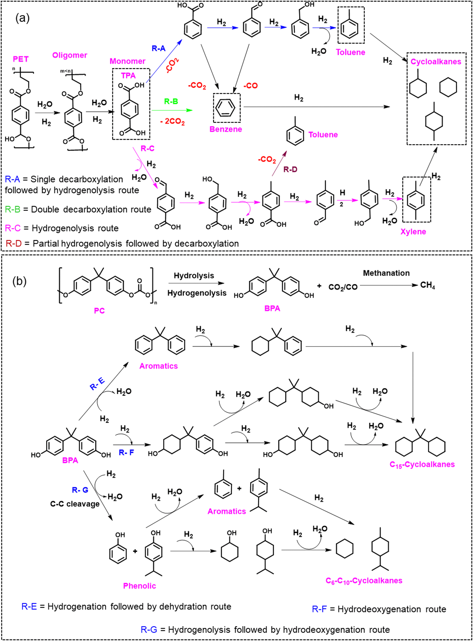 | Scheme 1 Schematic depiction of various catalytic routes operated during the hydrogenolysis/hydrodeoxygenation of (a) PET and (b) PC.25,42–47,74–81 | ||