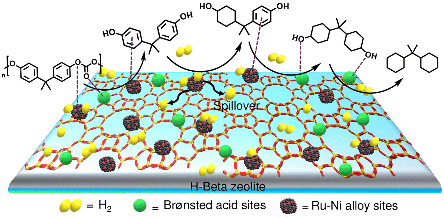 The development of a mono-catalytic system for the selective hydrodeoxygenation of PC holds significant importance in enhancing economic viability and industrial feasibility. Recently, Manal et al. reported the synthesis of a bifunctional Ru–Ni supported H-beta catalyst for the hydrodeoxygenation (HDO) of bisphenol A (BPA) and PC to high-density propane-2,2-diyldicyclohexane under mild conditions.47 The study suggested that the alloy formed between Ru and Ni was responsible for the enhanced catalytic activity. Catalytic data indicated that the selectivity for propane-2,2-diyldicyclohexane was dependent on the Ru/Ni weight ratio. A volcano plot demonstrated that a Ni/Ru weight ratio of 0.5 was optimal, achieving high selectivity for propane-2,2-diyldicyclohexane. Higher Ni/Ru ratios (>0.5) resulted in a larger domain of Ni species, which significantly influenced selectivity and promoted the formation of lower-range hydrocarbons via C–C bond cleavage. Ru sites on the catalyst facilitated H2 dissociation, which was transferred to the aromatic ring at the Ru–Ni alloy/support interface, resulting in BPA hydrogenation to form ring-hydrogenated cyclic alcohol. Additionally, Brønsted acid sites associated with the Ru–Ni alloy phases played a crucial role in cleaving Csp3–OH, leading to the formation of propane-2,2-diyldicyclohexane (Scheme 3).
