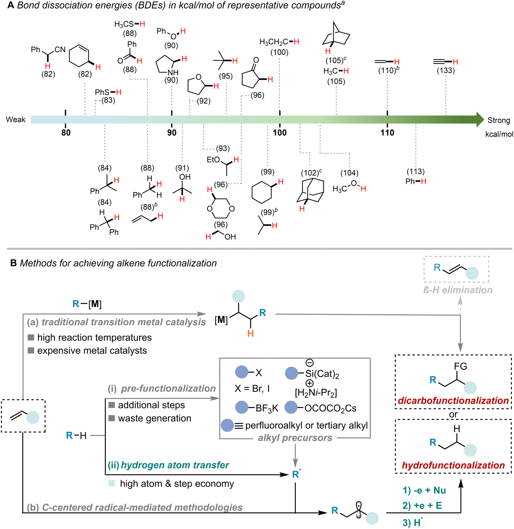 | Scheme 1 (A) Bond dissociation energies (BDEs) in kcal mol−1 of the X–H bonds (in red) of representative compounds. (B) Methods for achieving the functionalization of alkene. aBDEs values taken from ref. 18. bBDEs values taken from https://ibond.nankai.edu.cn. cBDEs values taken from ref. 19. | ||