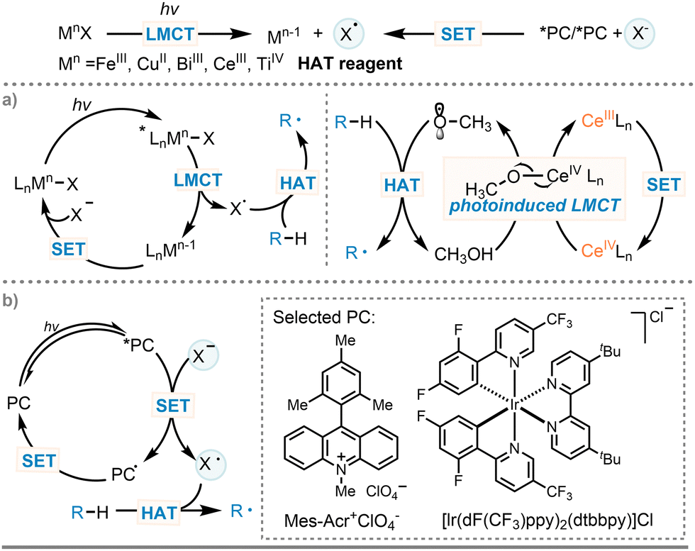 Fortunately, the hydrogen atom transfer strategy (HAT, X˙ + H–Y → X–H + Y˙) (Scheme 1(B), path b(ii)) developed in recent decades provides an effective tool for directly activating native C(sp3)–H bonds.50–53 Through the careful choice of a suitable HAT agent, this approach allows for the direct conversion of C(sp3)–H compounds into reactive C-centered radicals, eliminating the prerequisite for pre-functionalizing substrates. Such streamlined process enhances the incorporation of alkyl groups into acceptor alkenes while maintaining a high level of atom economy. Given the high bond dissociation energies of unactivated C(sp3)–H bonds, oxygen-centered radicals (with a BDE around 106 kcal mol−1 for the –OH group in tert-butanol) are recognized as effective HAT agent.54 Notably, peroxides like di-tert-butyl peroxide (DTBP) are prominent among the array of oxygen radical precursors. However, the generation of oxygen-centered radicals at elevated reaction temperatures poses challenges in setting up reaction conditions. Recently, as a mild alternative, photocatalysis has made significant contributions to the development of this field.55–58 Based on the hydrogen abstractor involved, HAT processes can be divided into two classes: direct (d-), indirect (i-) HAT (Scheme 2).59–62 In the direct case, the excited state of the photocatalyst abstract a hydrogen atom from a substrate R–H, leading to the formation of C-centered radicals (R˙) and the deactivated form of the photocatalyst. The latter is subsequently recovered through reverse hydrogen atom transfer (RHAT) or continuous single electron transfer (SET) and proton transfer (PT) processes (Scheme 2(A)). Compared to direct HAT approach, indirect HAT methods display different selectivity and reactivity, offering an alternative tactic for the generation of C-centered radicals. In this process, additional HAT reagents are required to facilitate a single electron transfer with *PC, ultimately delivering a hydrogen atom abstractor to abstract the hydrogen atom and generate C-centered radicals (R˙) while regenerating X–H (Scheme 2(B)). In recent years, ligand-to-metal charge transfer (LMCT), an inner-sphere single-electron transfer process, that is independent of the oxidation–reduction potential, has emerged as a key strategy for generating radical intermediates (HAT reagents) in photocatalytic redox reaction (Scheme 3(a), left).63,64 Specifically, the ligand-centered radicals and single electron reduced metal centers are generated through homolysis of metal–ligand bonds upon light irradiation. This process is mainly used for iron, copper, bismuth, cerium, and titanium halide complexes. Additionally, radical intermediates can also be produced through photoredox catalyzed outer-sphere single-electron transfer, which relies on the use of photocatalysts with high reduction potential in excited states (Scheme 3(b)).65