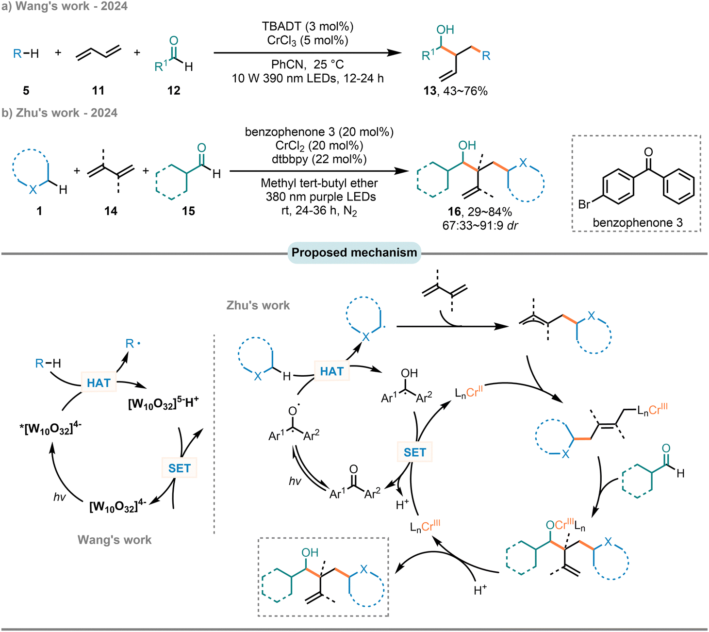 Allyl and hydroxyl functionalities are common structures in functional organic molecules, hold significant value for their versatility.78,79 Consequently, the concomitant incorporation of these groups as fundamental structural units in the assembly of complex structures is of great significance across numerous disciplines. In 2024, the independent research by the Wang group80 and the Zhu group81 introduced a dual catalytic system that combines photo-induced HAT with chromium catalysis, enabling the efficient accomplishment of three-component Nozaki–Hiyama–Kishi (NHK) type reactions of 1,3-butadienes (11 or 14) with C(sp3)–H partners (5 or 1) and aldehydes (12 or 15) (Scheme 8). Unlike CrCl2/photocatalyzed two-component reactions involving alkanes and aldehydes that activate C(sp3)–H compounds via ligand-to-metal charge transfer (LMCT)82,83 or by excited aldehyde,82 this method markedly differs, initiating transformation through direct H-abstraction from radical precursors by an excited TBADT or a triplet state diaryl ketone, producing both a C-centered radical and the reduced decatungstate [W10O32]5− or a ketyl radical. The C-centered radical further engaged in an addition reaction with 1,3-butadiene, thereby yielding an allyl radical intermediate, which is then trapped by a CrII catalyst to give rise to π-allyl chromium intermediate. Subsequently, the oxidative addition of aldehydes into this intermediate take place, followed by a protonation step to give the final product and release of CrIII catalyst. The latter is reduced by [W10O32]5− or ketyl radical to CrII. This SET process releases a proton and recovers [W10O32]4− or diaryl ketone photocatalyst.