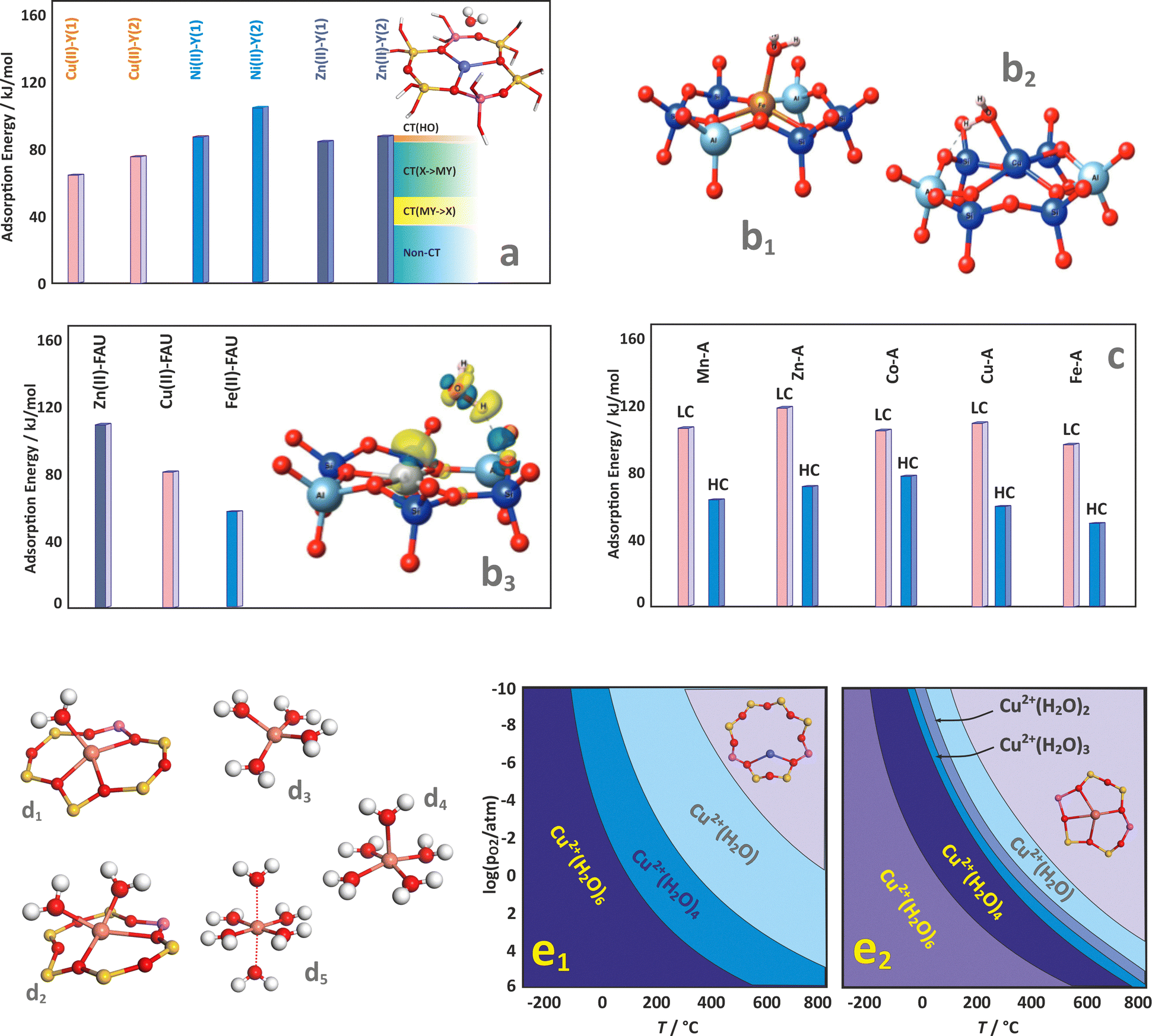 | Fig. 2 Exemplary (DFT optimized) coordination patterns of selected isolated TMI hosted in MFI frameworks with the illustrative spin density distribution for Co2+ cation in the high (S = 3/2) and low (S = 1/2) spin states (a). Coordination environments of single Cu2+ cations showing the effect of site topology (b1), and Al distribution (b2) and (b3) on the TMI relative stability (based on data published in the ref. 82). Dimer Cu–Cu sites in CHA (c) and Fe–Fe sites in FER (d). | ||
