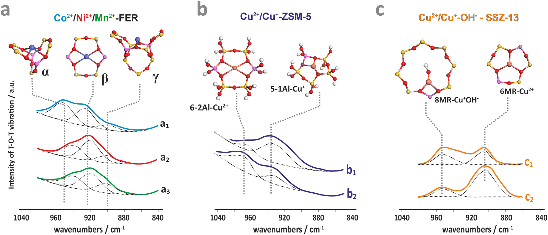 The resultant structural deformations are well reflected in the IR spectra of the T–O–T asymmetric skeletal vibrations (T = Si or Al).85 The extent of this perturbation and the ensuing shift of the perturbed asymmetric T–O–T vibration varies with the valence state, size, particular exchangeable position the hosted ion occupies in the zeolite framework, and the presence of co-ligands as well.86 The corresponding IR bands appear between two strong bands of antisymmetric and symmetric T–O–T vibrations, and are shifted from 1020–1100 cm−1 to about 800–1000 cm−1 upon accommodation of the alien cations. This effect can be exemplified by the Cu2+, Ni2+, and Mn2+ hosted in the FER matrix (Fig. 3a), and Cu2+, Cu2+–OH− and Cu+ in ZSM-5 (Fig. 3b) and SSZ-13 (Fig. 3c).86–88 In the case of small charge cations (Cu+, Cu2+–OH− or Zn+), these deformations and the associated T–O–T frequency shifts are less pronounced (Table 1). The perturbed T–O–T vibrations can be used, for instance, to differentiate between the single Cu2+ species located in 6MR (900 cm−1) and the Cu2+–OH− centres in 8MR (∼950 cm−1) rings present in the CHA zeolite.88