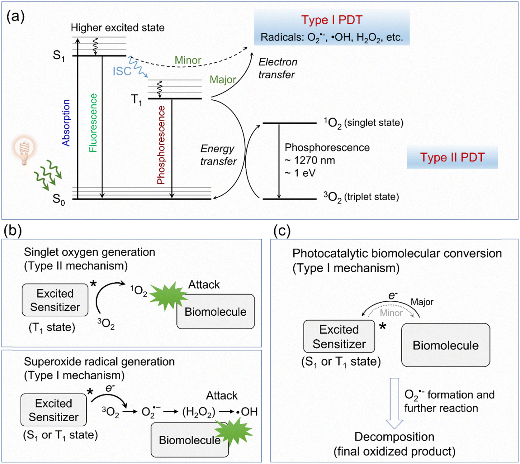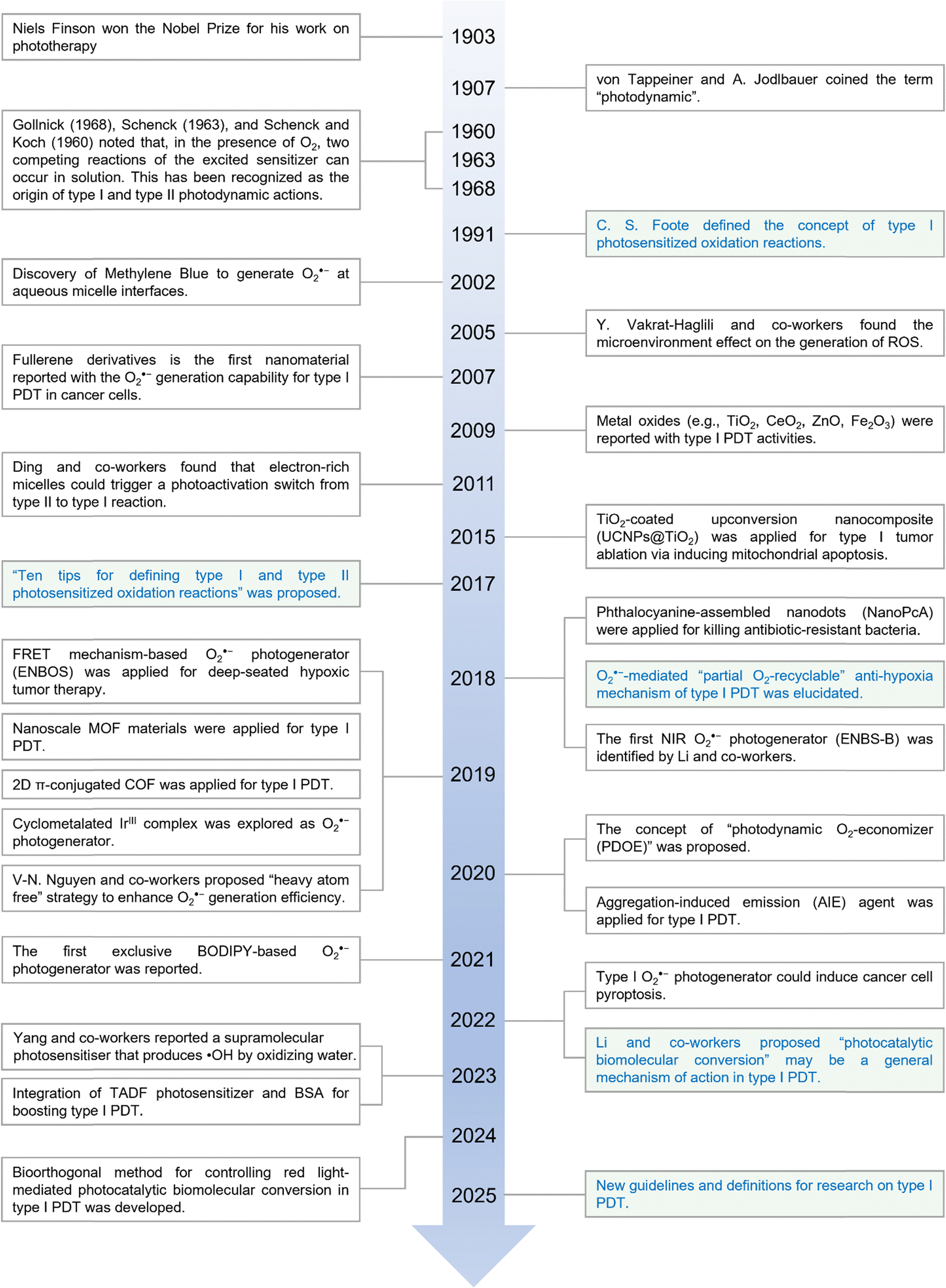 In the evolving landscape of PDT, inconsistencies in terminology and definitions regarding type I photosensitized oxidation reactions have hindered progress. Discrepancies in reaction mechanisms, detection techniques, and application fields, often stemming from insufficient communication among professionals in photoscience, have created unnecessary misunderstandings and confusion. To foster a unified and accurate understanding of type I mechanisms, it is essential to bridge these gaps and establish a coherent framework. This section introduces an updated and comprehensive definition of type I PSs, highlighting their mechanisms of action and detection methodologies. By tracing the historical development of type I PDT, we provide a detailed exploration of its photophysical and photochemical processes, such as the photoinduced electron transfer mechanism in organic molecular dyes and the photon-generated electron–hole pair mechanism in inorganic nanomaterials. In particular, to present a holistic perspective of this dynamic field, we summarize the chemistry and biology of type I related ROS, including O2˙−, hydroxyl radicals (˙OH), and hydrogen peroxide (H2O2). Drawing upon our research group's unique insights, we delve into the current status and challenges of type I PDT, offering a clear and forward-looking analysis of this transformative therapy. They are detailed in the following sections: