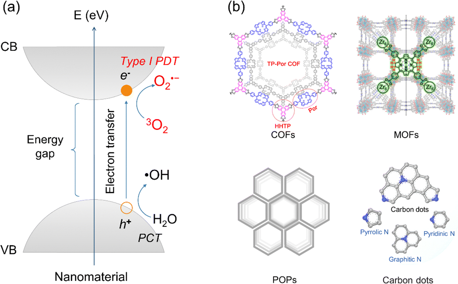 | | Fig. 3 (a) Schematic diagram of the typical excitation process in inorganic nanomaterials, illustrating the transition of electrons from the valence band (VB) to the conduction band (CB) upon photoirradiation, followed by type I PDT and PCT processes. (b) Examples of diverse inorganic and hybrid nanomaterials employed in type I PDT, such as covalent organic frameworks (COFs), metal–organic frameworks (MOFs), porous organic polymers (POPs), and carbon dots (CDs). | |