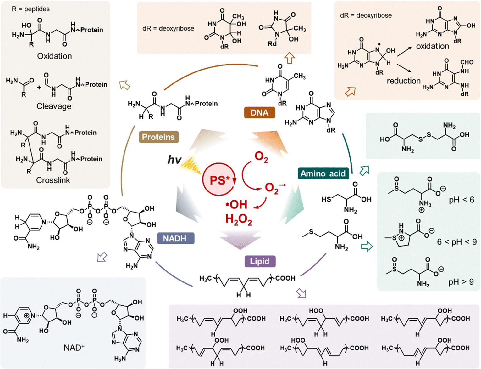 It is worth noting that theoretically, singlet state PSs (i.e., 1[PS*]) are also capable of initiating electron transfer pathways to finish type I photochemical reactions. However, due to the extremely short lifetime of 1[PS*], this pathway is less significant and is not considered a dominant mechanism in type I PDT, often being overlooked in mechanistic studies.