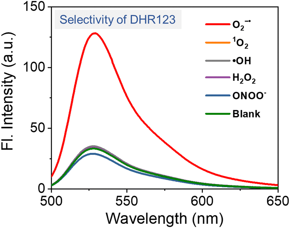Fluorescence-based detection methods are widely favored due to their ease of use, rapid processing, and cost efficiency. Various fluorescence probes have been developed for detecting O2˙− in solutions or in vitro. Among these, dihydrorhodamine 123 (DHR123) is a well-established probe for O2˙− detection in solution.84,85 DHR123 undergoes selective oxidation by O2˙− to produce the fluorescent compound rhodamine 123. Since DHR123 has been reported to be able to detect H2O2 in the presence of peroxidase,86,87 its specificity for O2˙− has been a subject of debate.85 To address this, we conducted a responsiveness experiment and demonstrated that DHR123 only reacts selectively with O2˙−. Without peroxidase, DHR123 also shows no responses to H2O2 (Fig. 5). This finding confirms DHR123 as a reliable and selective probe for sensing O2˙− in various solvents (e.g., water, methanol, and DMSO). However, due to the ubiquitous presence of peroxidases in intracellular environments, DHR123 is unsuitable for detecting O2˙− in cells. Other typical O2˙− probes include dihydroethidium (DHE)88 and MitoSOX Red,89 which are widely used membrane permeable fluorescence indicators. DHE reacts with O2˙− to form 2-hydroxyethidium, which can integrate into chromosomal DNA to emit red fluorescence in the nucleus.88 MitoSOX Red, a cationic derivative of DHE, is specifically designed to detect mitochondrial O2˙−.89 Its detection mechanism mirrors that of DHE, making it ideal for visualizing O2˙− within mitochondria. However, both DHE and MitoSOX Red required the presence of DNA for fluorescence emission, limiting their applicability to cellular studies rather than solution-based tests. Recently, HKSOX-1, a trifluoromethyl sulfonate ester-functionalized 5-carboxy-2′,4′,5′,7′-tetrafluorofluorescein, was developed as a novel O2˙− probe.90 This commercially available probe can specifically detect O2˙− in both solutions as well as intracellular environments, overcoming some of the limitations of traditional fluorescence probes.