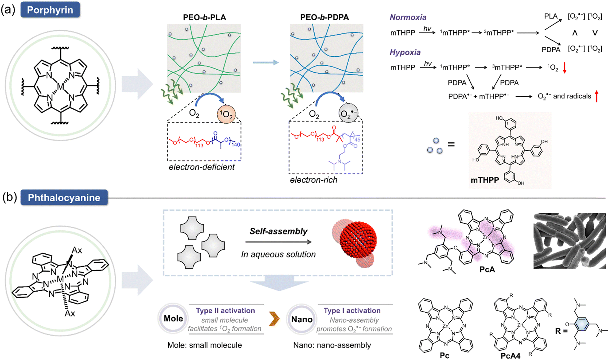 In type I PDT, PSs play a pivotal role in driving the therapeutic process. So far, a diverse array of PSs have been developed, which can be broadly categorized into two categories: (1) organic molecular dyes and (2) inorganic (hybrid) nanoparticles. At the core of type I PDT lies a fundamental photochemical reaction in which electrons are transferred from PSs to oxygen or other substrates, generating radical cations or anions. Notably, such an electron transfer mechanism differs significantly between organic molecules and inorganic nanoparticles, reflecting their distinct photophysical and photochemical properties.