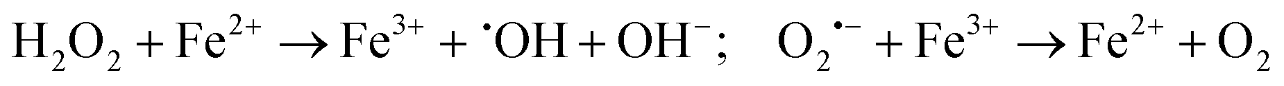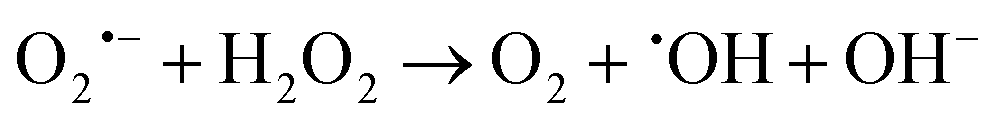 H2O2 produced in the disproportionation participates in the Fenton reaction, reacting with Fe2+ to generate ˙OH, a highly toxic species. Concurrently, remaining O2˙− can react with Fe3+ to regenerate oxygen (reaction (2)).72 O2˙− also modulates H2O2 reduction through the Haber–Weiss reaction, producing ˙OH and oxygen (reaction (3)).