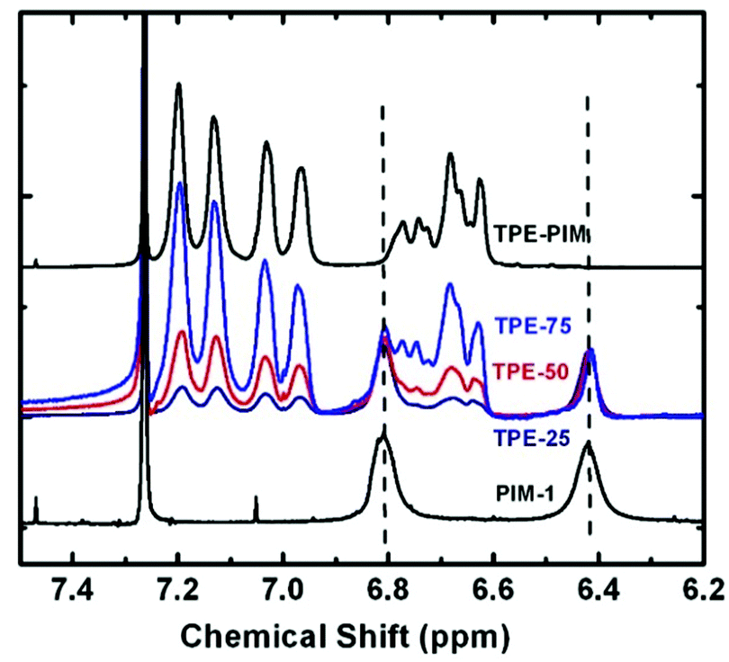 Fig. 1 Proton NMR of TPE-PIM, PIM-1 and TPE-PIM-1 copolymers; the peaks of the copolymers were normalized at 6.41 ppm. |
