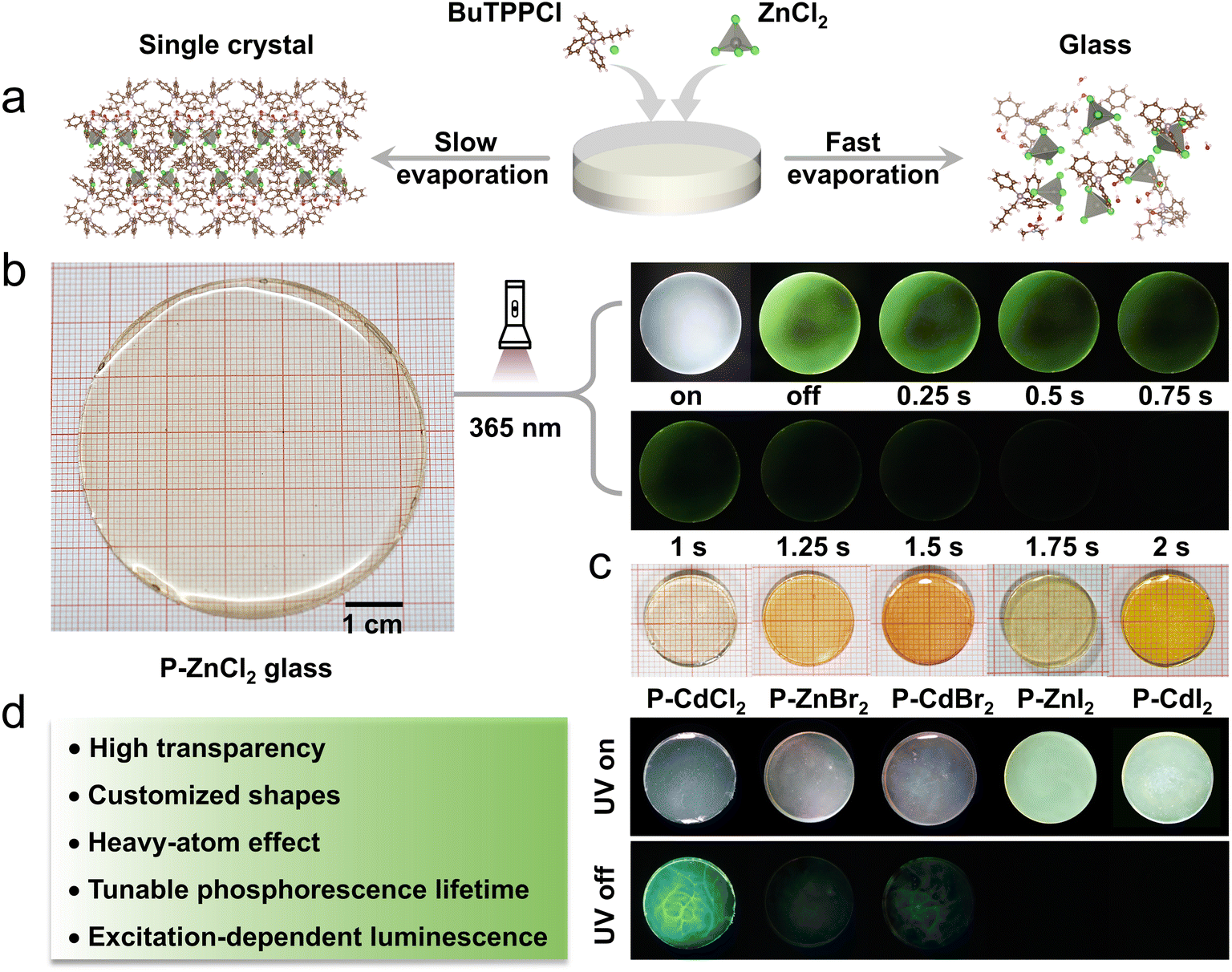 Fig. 1 (a) Schematic diagram of illustrating the controllable synthesis of P-ZnCl2 glass and crystal via the solvent-assisted rapid and slow evaporation method. The left side shows the crystal structure of P-ZnCl2 single crystal, and the right side shows the amorphous molecular structure of P-ZnCl2 glass. (b) Photographs of P-ZnCl2 glass with a diameter of 6 cm under ambient light, UV irradiation (365 nm), and UV off. (c) Photographs of P-CdCl2, P-ZnBr2, P-CdBr2, P-ZnI2, and P-CdI2 glasses under ambient light, UV irradiation (365 nm), and UV off. (d) The typical features of the (BuTPP)2MCl2X2 glasses.