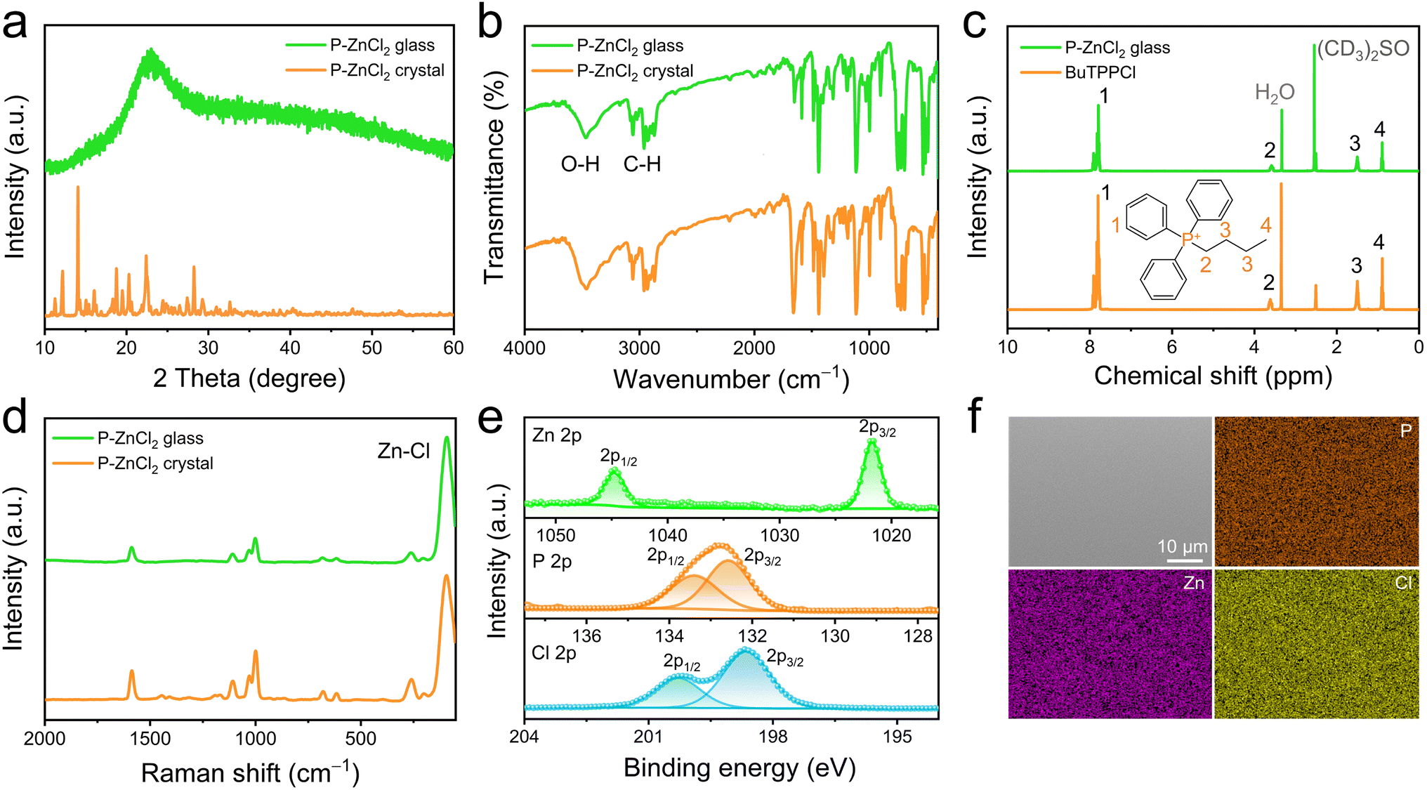 Fig. 2 (a) PXRD patterns of P-ZnCl2 glass and crystal. (b) FTIR spectra of P-ZnCl2 glass and crystal. (c) 1H NMR spectra of P-ZnCl2 glass and BuTPPCl molecule. (d) Raman spectra of P-ZnCl2 glass and crystal. (e) High-resolution XPS spectra of Zn 2p, P 2p, and Cl 2p in P-ZnCl2 glass. (f) SEM image and EDS elemental mapping of P, Zn, and Cl in P-ZnCl2 glass.