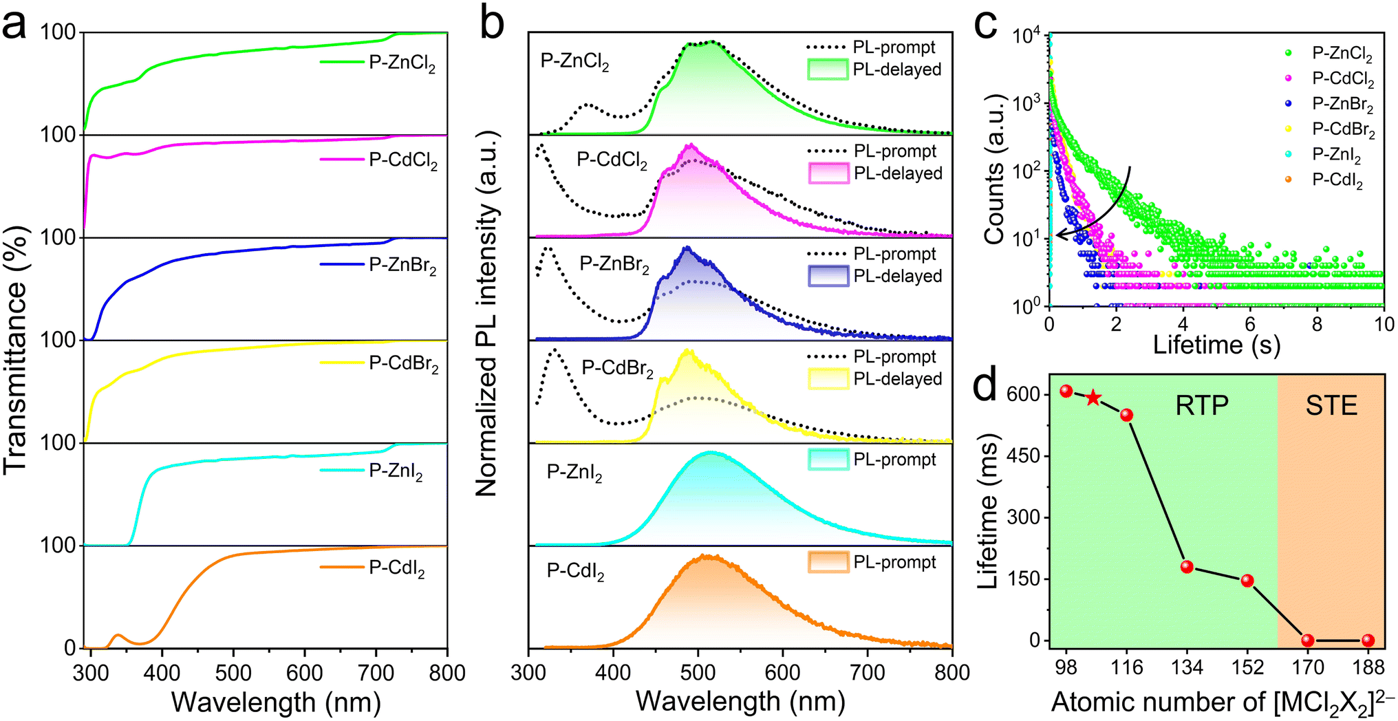 Fig. 3 (a) Transmittance spectra of (BuTPP)2MCl2X2 glasses. (b) The prompt and delayed PL spectra of (BuTPP)2MCl2X2 glasses. (c) Time-resolved phosphorescence decay curves of (BuTPP)2MCl2X2 glasses. (d) The phosphorescence lifetimes of (BuTPP)2MCl2X2 glasses as a function of atomic number of [MCl2X2]2− in (BuTPP)2MCl2X2 glasses.