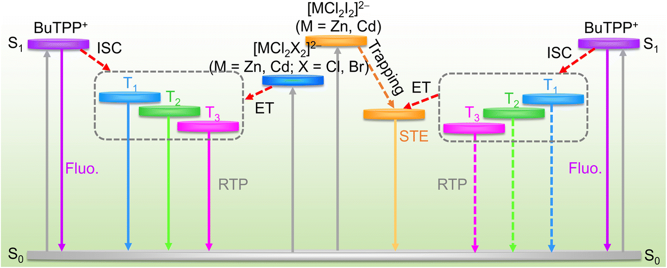 Based on the above results, the possible energy transfer pathways are illustrated in Fig. 4. The excited state energy levels and emission energy levels are calculated based on the excitation and emission wavelengths of these materials (Fig. S15). As for organic molecule BuTPPCl, photoexcitation promotes electrons to the singlet state S1, from which some electrons relax to the ground state S0, producing fluorescence. Others undergo an ISC process to the triplet states (T1, T2, T3), resulting in afterglow emission. For P-ZnCl2, P-CdCl2, P-ZnBr2, and P-CdBr2, the observed triplet phosphorescence originates not only from the singlet state of organic cation BuTPP+, but also from the energy transfer involving the inorganic metal halide units. As shown in Fig. S7a, the delayed PL spectra of BuTPPCl molecule reveal three triplet sublevels (T1, T2, and T3), with the T2 emission located at 492 nm. The excitation spectrum monitored at 492 nm matches that of the singlet state (Fig. S7b), indicating that the triplet emission in BuTPPCl primarily arises from the singlet state. Upon incorporation of ZnCl2, the resulting P-ZnCl2 glass exhibits a similar triplet phosphorescence profile to that of BuTPPCl (Fig. 3b). However, the excitation spectrum monitored at 492 nm for the triplet emission not only overlaps with the singlet state excitation spectrum but also displays an additional low-energy broadband excitation peak at 426 nm (Fig. S15a), suggesting that the triplet luminescence originates from both the singlet state and newly introduced inorganic metal halide units (Fig. 4). For P-CdCl2, P-ZnBr2, and P-CdBr2, the photoluminescence excitation (PLE) spectra also exhibit the same characteristics, that is the PLE spectrum not only overlaps with the singlet state excitation spectrum, but also exhibits a new low-energy broadband excitation peak (Fig. S15b–d), indicating that the triplet luminescence not only originates from the singlet state, but also from newly introduced inorganic metal halide units [MCl2X2]2− (Fig. 4). The harvested excitons from [MCl2X2]2− can efficiently populate the triplet states of BuTPP+, thereby enhancing its phosphorescence. Substitution of Cl with Br and Zn with Cd in [ZnCl2X2]2− introduces heavy-atom effect and enhances SOC, accelerating ISC and reducing the phosphorescence lifetimes. Consequently, P-CdBr2 exhibits the shortest afterglow lifetime among the four (BuTPP)2MCl2X2 glasses.