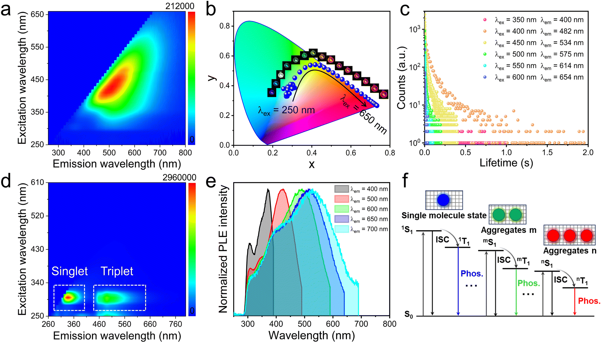 Fig. 5 (a) 2D excitation–emission matrix spectra of P-ZnCl2 glass at room temperature. (b) CIE chromaticity coordinate diagram of P-ZnCl2 glass at various excitation wavelengths. Insets show luminescence photographs of P-ZnCl2 glass under various excitation wavelengths. (c) Time-resolved PL decay curves of P-ZnCl2 glass under different excitation and emission wavelengths. (d) 2D excitation–emission matrix spectra of BuTPPCl molecule at room temperature. (e) Excitation spectra of P-ZnCl2 glass monitored at different emission wavelengths at room temperature. (f) Proposed mechanism of multicolor luminescence at different excitation wavelengths with multiple aggregate clusters in P-ZnCl2 glass.