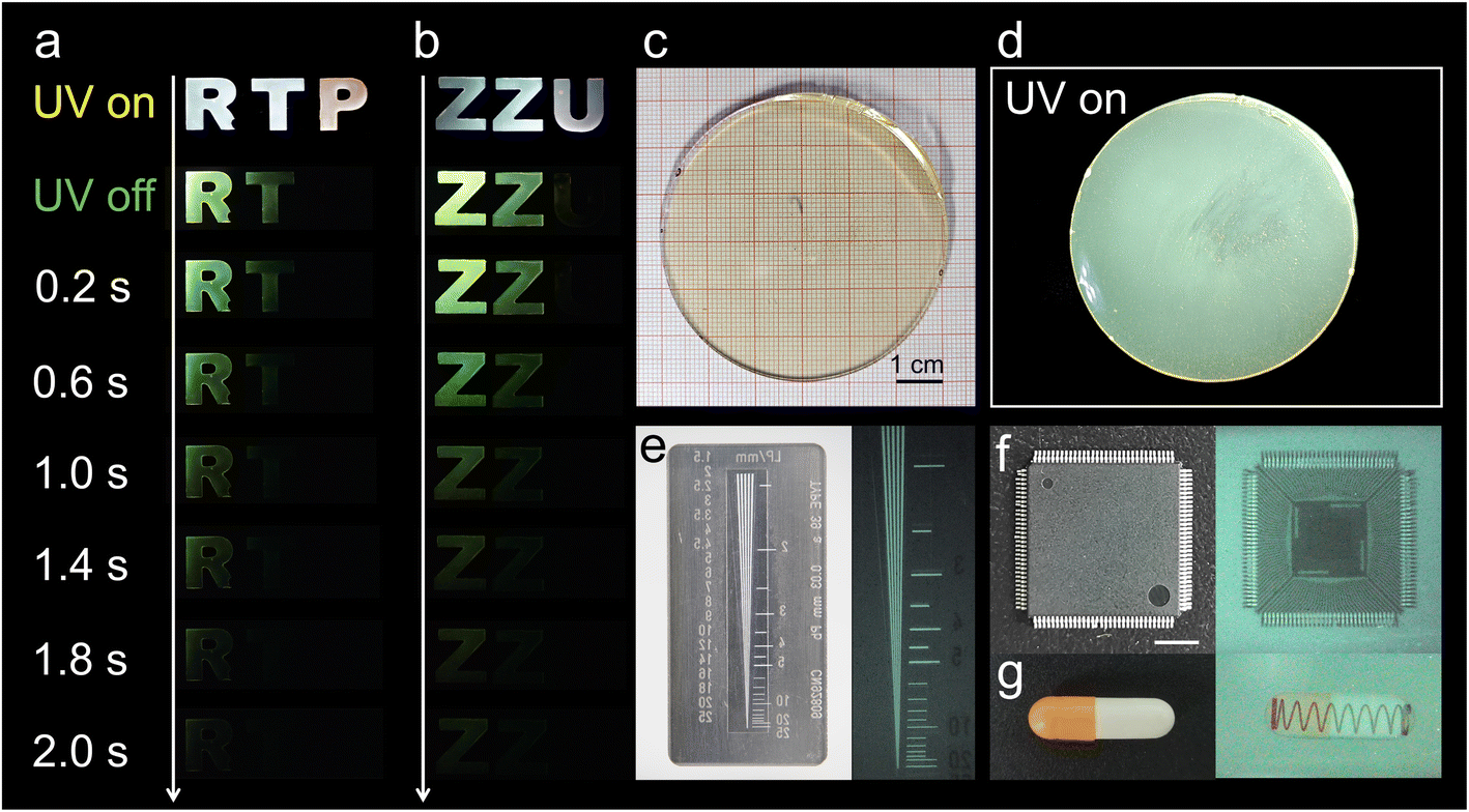 Fig. 6 Multiple anti-counterfeiting processes based on (a) “RTP” and (b) “ZZU” shaped glasses exhibiting distinct afterglow lifetimes after 365 nm UV cessation. Photographs of P-ZnI2 glass scintillation screen with a diameter of 6 cm under (c) ambient light and (d) 365 nm UV light irradiation. (e) Photograph and X-ray image of a standard 25 lp mm−1 line pair card using P-ZnI2 glass as scintillation screen. Photographs and X-ray images of a chip (f) and a capsule containing metallic spring (g) using P-ZnI2 glass as scintillation screen.