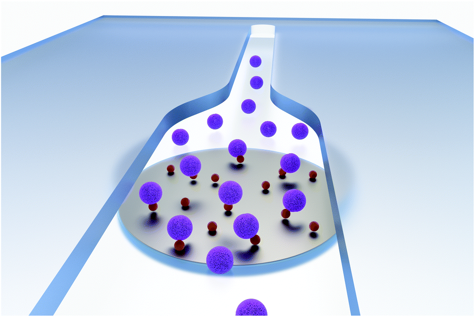 | | Fig. 1 Scheme of the directed coupling of liposomes (purple spheres, 135 nm in diameter) with magnetic nanoparticles (brown spheres, 30 nm in diameter) inside a microfluidic channel. The particles are captured on a magnet while liposomes bind to the particles on their way through the channel (flow from back to front). | |