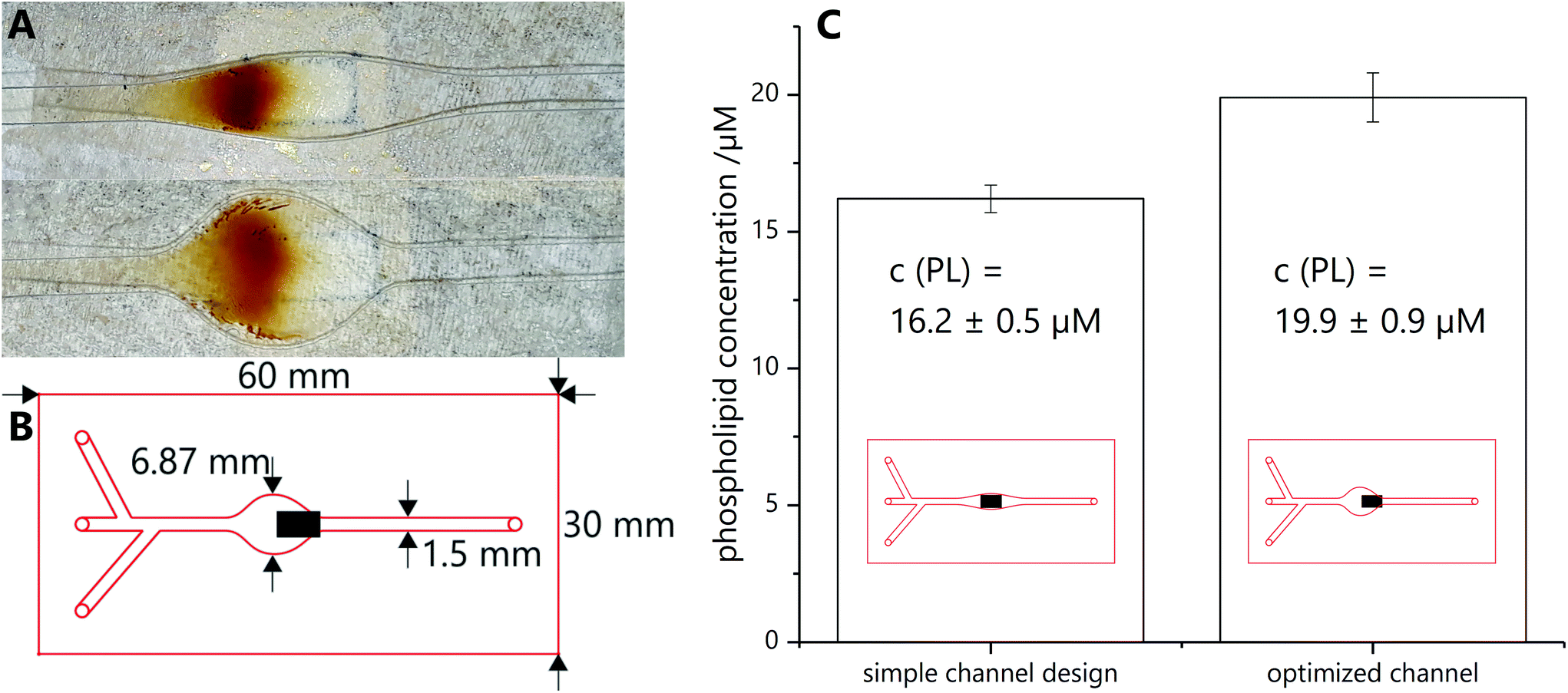 | | Fig. 2 (A) Same particle amount caught on simple (top) and optimized (bottom) channel. The underlying magnet is visible as faint grey square (flow direction from left to right). (B) Shape and dimensions of the optimized microfluidic chip with three inlets and one outlet. The black box represents the underlying magnet with a size of 5 × 3 mm. Its magnetic field lines lead to the capture of the magnetic beads as shown in (A). (C) Comparison of phospholipid concentration measured by ICP-OES for simple and optimized channel layout (4 samples, 3 times measured). | |