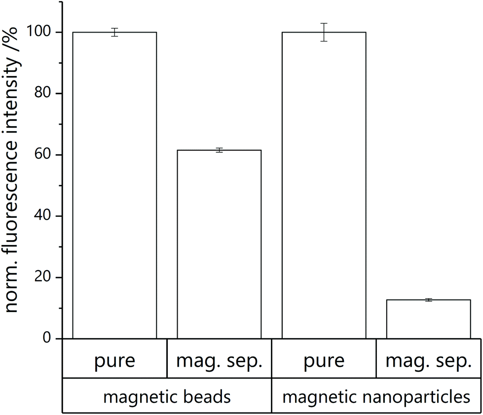 Prior to measurement, all wells are blocked with washing buffer (2 × 50 μL per well) and washed with HEPES buffer (2 × 50 μL per well). Then the microfluidic product (each 30 μL per well) is added. Analysis is performed with consecutive washing steps with fluorescence measurement after each step. First, the unaltered sample as collected from the microfluidic chip diluted in HEPES buffer (pure in Fig. 3) as well as an equally diluted sample in OG solution for lysis (pure lysed) are measured. After measurement, the microtiter plate is positioned on a magnetic plate (96S Super Ring Magnet Plate with NdFeB magnets, http://www.alpaqua.com) and the supernatant of the pure sample solution in HEPES buffer is taken off. The remaining beads are resuspended in HEPES buffer and measured again (mag. sep.). This step is repeated, but with addition of OG solution instead of HEPES buffer (mag. sep. lysed).