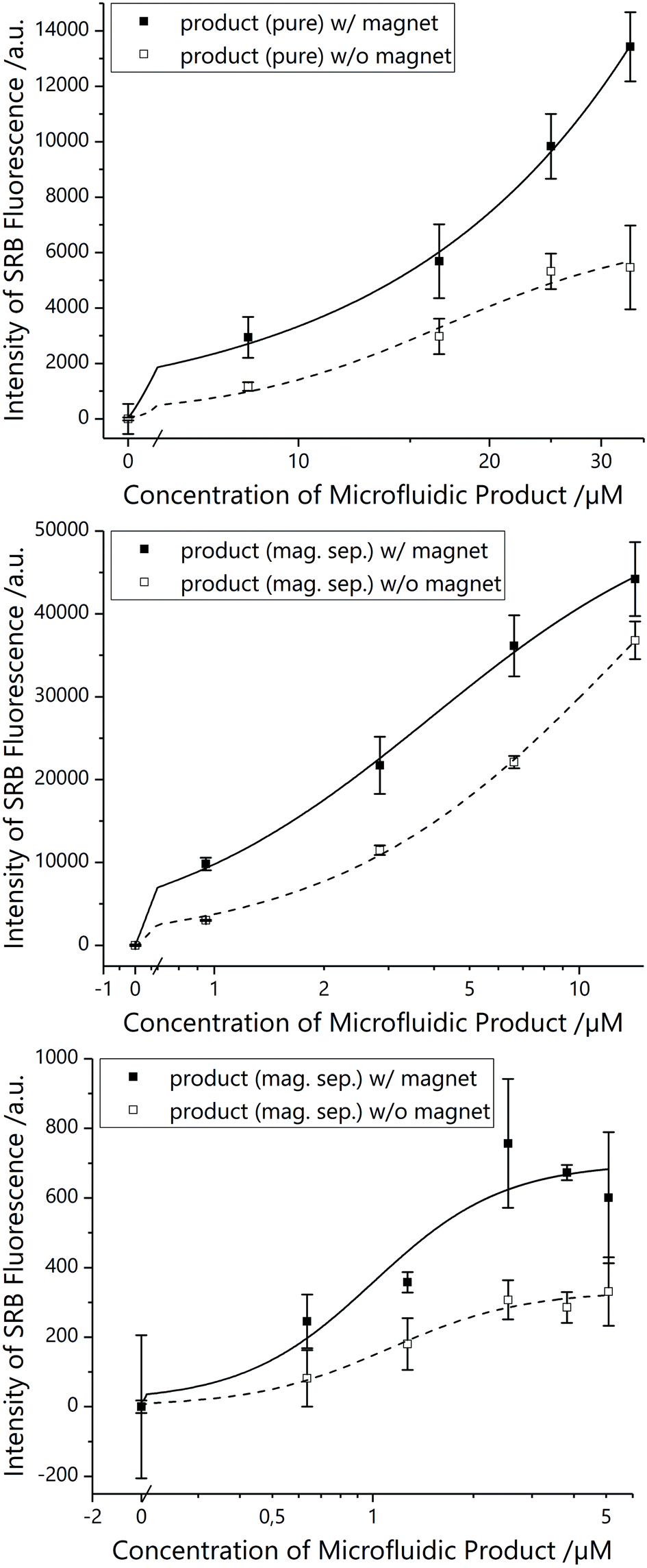 | | Fig. 4 Biotin–streptavidin-binding assay with microfluidic coupling product between magnetic particles and liposomes bearing biotin on the surface, performed in parallel in the absence and presence of an external magnetic field. top: Pure product with 1 μm MBs without any purification. middle: Product with 1 μm MBs after magnetic separation (mag.sep.), concentration given in percent of pure MB product (undiluted product after magnetic separation equalling 61.6% of pure MB product). bottom: Product with 30 nm MNPs after magnetic separation (mag.sep.), concentration given in percent of pure MNP product (undiluted product after magnetic separation equalling 12.7% of pure MNP product) (3 samples). | |