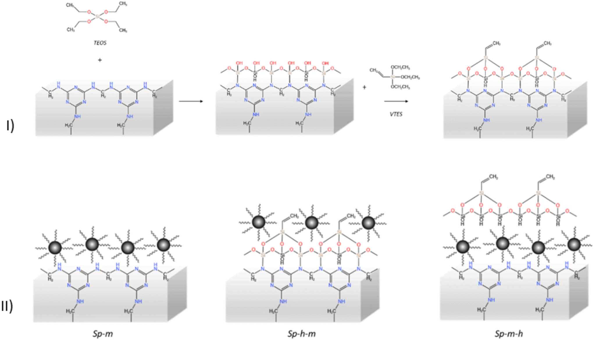 The melamine sponge is receiving great attention because of its availability, high elasticity and capacity. It should be noted that in the literature the performance of the sponge materials is expressed by both “absorption” and “adsorption” capacity due to the processes of holding oil within their volume (pores and channels) and the adherence of the oil to the sponge surface, especially after modification. In the present work, the term “adsorption” capacity was adopted for the general discussion and for the presentation of the results to emphasize the performed surface modification. It is known that surface functional groups such as hydroxyl (–OH), amino (–NH2), and secondary amine (–NH) groups are important features, which can be engaged either in chemical reactions (e.g. silanization) or in the attachment of various nanoparticles to endow specific properties.16 For oil removal applications, a high selectivity to oil and simultaneous water repellency is targeted by altering the sponges' roughness and surface energy as well as a high stability over multiple sorption/desorption cycles without any secondary pollution of the treated water. Therefore, melamine sponges possessing inherent hydrophilicity and oleophilicity are being modified with hydrophobic components and functional nanoparticles to become highly selective for oil compounds as well as to respond to external stimuli (e.g., magnetic field, light) when appropriate. Beyond hydrophobicity, additional magnetic, photothermic, anti-icing, etc. properties have been pursued. Modifiers such as silanes,14,17 hydrophobic polymers,18,19 nanoparticles of titania and iron oxide,20–23 two-dimensional MXenes and carbon nanomaterials (graphene, reduced graphene oxide)6,24,25 as well as combinations of them26–28 have been investigated. Adsorption capacities ranging from 4 to 240 g g−1 (g oil per g sponge) and hydrophobicity between 120° and 169° WCA) have been achieved, depending on the selected agents and modification methods. Synthetic procedures, such as dip-coating,17,18,29,30 in situ growth of nanoparticles,31 and polymerization32,33 as well as solvothermal treatment34 and sol–gel,35 have been employed. Among those, sol–gel and dip-coating impregnation with or without thermal curing appeared to be the most frequently used16 due not only to the relatively high selectivity (140°–150°) and adsorption capacities (50–140 g g−1) achieved but also to the mild conditions and cost-effective, scalable processing.