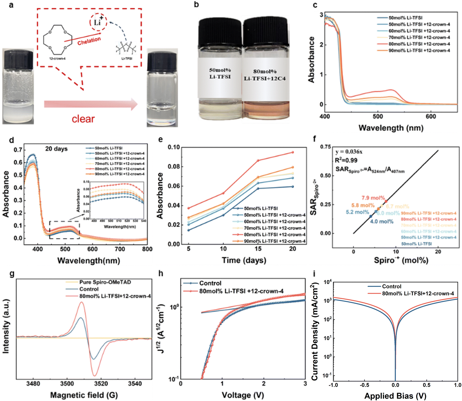 In order to study the doping effects of higher concentration of Li-TFSI on Spiro, we prepared 1 mL of Spiro solution, in which 3.82 μL of 12-crown-4 was added to replace tBP, doped with different concentrations (50 mol%, 60 mol%, 70 mol%, 80 mol%, and 90 mol%) of Li-TFSI. Meanwhile, the Spiro solution doped with 50 mol% Li-TFSI and tBP was prepared as the control group. Firstly, the color changes of different solutions were observed. The freshly prepared Spiro:Li-TFSI/12-crown-4 solutions and Spiro:50 mol% Li-TFSI/tBP solution were both pale yellow. However, as shown in Fig. S1 (ESI†), after being exposed to light under anaerobic conditions for 2 hours, the Spiro:Li-TFSI/12-crown-4 solutions changed from light yellow to reddish brown, and the color deepened with increasing Li-TFSI doping concentration, which should be related to the generation of Spiro˙+. Among them, the Spiro:80 mol% Li-TFSI/12-crown-4 solution, which exhibits the deepest color, presents a striking contrast with the control group solution that is still pale yellow (Fig. 1b). The results indicate that the Li-TFSI/12-crown-4 system can doped Spiro under anaerobic conditions and the color deepening of the Spiro solution can be attributed to the increased production of Spiro˙+.