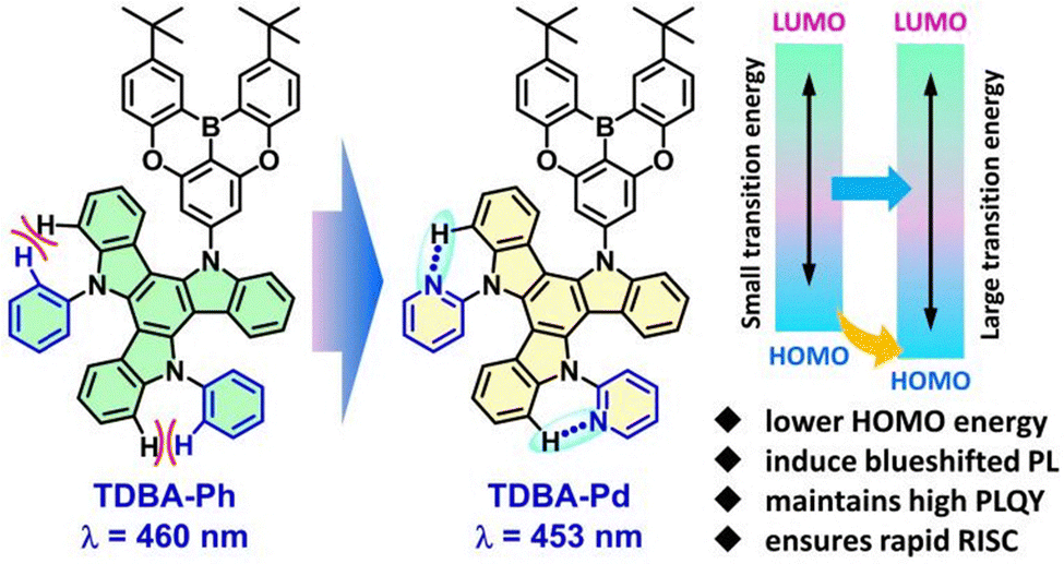 Thermally activated delayed fluorescence (TADF) materials, which enable 100% exciton utilization via reverse intersystem crossing (RISC), play a pivotal role in advancing organic light-emitting diodes (OLEDs). However, designing blue TADF emitters remains challenging due to the inherent trade-off between short emission wavelength and small singlet–triplet splitting. In this study, a strategy for developing such emitters is proposed by introducing pyridyl groups into the triindocarbazole donor to form intramolecular C–H⋯N hydrogen bonds. Compared with the phenyl-substituted counterpart TDBA-Ph, the pyridyl-incorporated TDBA-Pd exhibits a blueshifted emission (453 versus 460 nm in toluene) and a deeper HOMO energy (−5.63 eV vs. −5.58 eV). Both TDBA-Ph and TDBA-Pd exhibit high luminescence efficiencies of 94% and 88%, respectively, accompanied by rapid RISC rates of 1.85 × 106 s−1 and 1.57 × 106 s−1. Non-doped OLEDs based on these emitters demonstrate impressive performance: TDBA-Ph and TDBA-Pd exhibit the maximum luminance (Lmax) of 25
