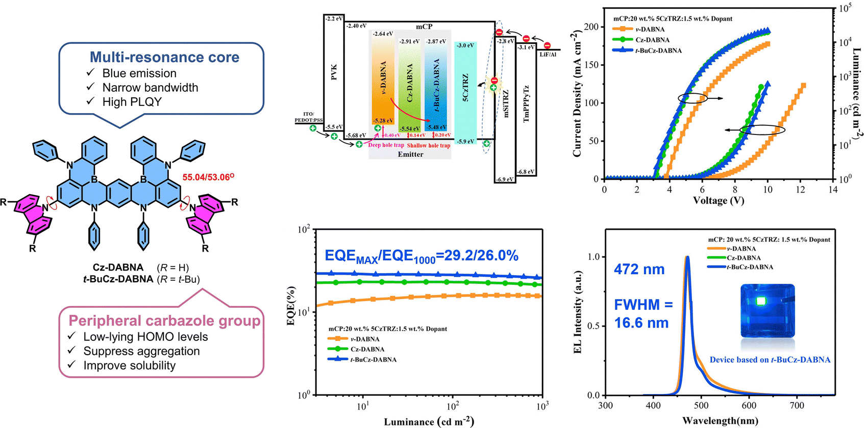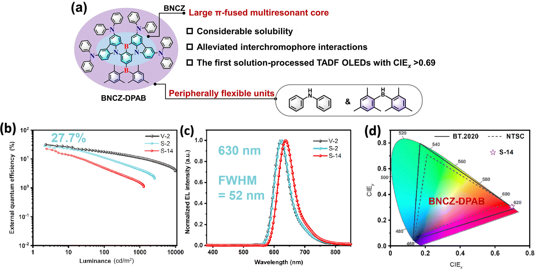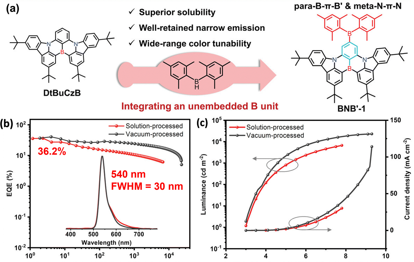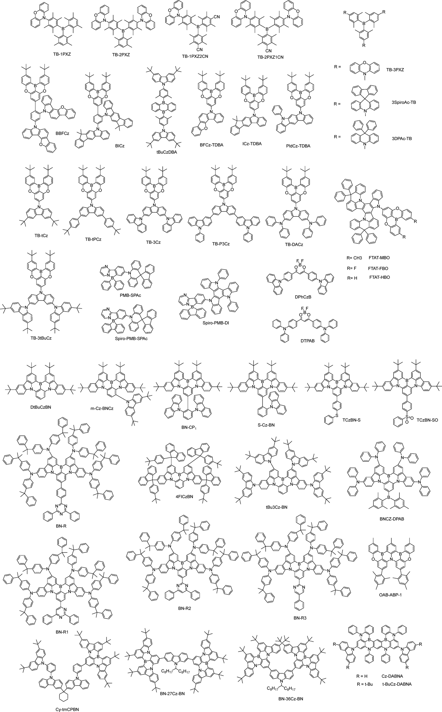 All these results demonstrate the versatility of boron-based molecular design in advancing high-performance solution-processable TADF materials. These emitters cover a broad range across the whole visible spectrum, also showing great potential in achieving both exceptional device performance and high color purity.