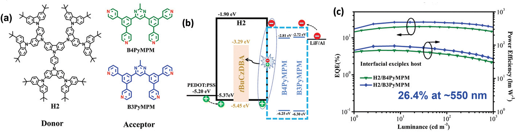 A rigid and symmetric oxygen–boron–oxygen bridged acceptor is typically coupled directly to carbazole-type donors with a D–A configuration, yielding efficient deep-blue TADF emitters with narrowband emission. Choi and co-workers reported several non-doped solution-processable TADF emitters.74,75 Among them, TB-tPCz delivers ultra-deep blue EL at 428 nm with an FWHM of 42.2 nm, as well as a high EQEMAX of 15.8% in a non-doped OLED.76 Wang and co-workers developed three A–π–D type TADF emitters, BFCz-TDBA, ICz-TDBA, and PldCz-TDBA. These emitters retain ultra-deep blue EL emission (424–433 nm) with narrow emission (an FWHM of 41–45 nm) and an EQEMAXs of 12.0–13.0% in doped OLEDs.77 Yan and co-workers adopted 3tBuCz as the donor, however, the resulting emitter, TB-3tBuCz, showed no intrinsic TADF in either solution or neat films. Notably, TADF emerges in the TB-3tBuCz/2,6DCzPPy exciplex system. The corresponding solution-processed devices exhibit ultra-deep-blue EL at 425 nm with an FWHM of 46 nm and a high EQEMAX of 14.6%.78 Wang and co-workers constructed two interfacial exciplex hosts, H2/B4PyMPM and H2/B3PyMPM, for tBuCzDBA-based solution-processed OLEDs, achieving high EQEMAX exceeding 20%. Notably, replacing para-linked B4PyMPM with meta-linked B3PyMPM improves interfacial carrier balance, resulting in a higher EQEMAX of 26.4% (Fig. 11).79 The same group pairs an intramolecularly locked triazatruxene donor with acceptors bearing methyl, hydrogen, or fluorine substituents, affording three blue TADF emitters. In their doped solution-processed OLEDs, FTAT-MBO and FTAT-HBO deliver deep-blue EL with an EQEMAX of 10.2% and 11.4%, respectively, while FTAT-FBO affords sky-blue EL with an EQEMAX of 17.5%. The emission variation is primarily due to the different electron-accepting abilities of different substituents.80 Yin and co-workers developed several spiro boron–nitrogen D–A compounds with tunable emission from deep blue to green based on the acceptor units. TPA-s-Mes*B exhibits deep-blue EL at 454 nm with an EQEMAX of 10.3%, while TPA-s-FMesBF shows green EL at 536 nm with an excellent EQEMAX of 22.1%.81