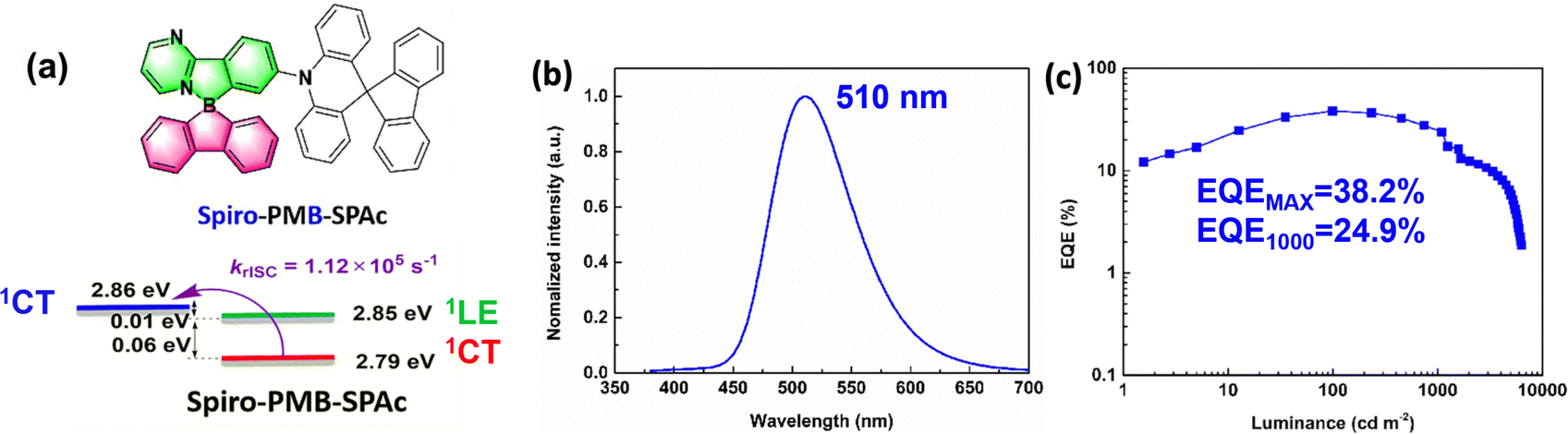 Tetracoordinate boron-based compounds are also effective acceptors in designing solution-processable TADF emitters. Wan and co-workers developed two TADF emitters, PMB-SPAc and spiro-PMB-SPAc, by introducing bulky four-coordinate boron into pyrimidine acceptors. The spiro structures enhance molecular rigidity and suppress nonradiative decay, achieving near-unity PLQYs in 10 wt% doped mCP films. A binary system of 1 wt% PMB-SPAc in CzAcSF achieves an EQEMAX of 26.04% at 492 nm, whereas spiro-PMB-SPAc exhibits improved performance with an EQEMAX of 34.68% at 496 nm. A ternary system (mCP: 20 wt% CzAcSF: 20 wt% spiro-PMB-SPAc) yields a higher EQEMAX of 38.2% (Fig. 15). Notably, spiro-PMB-SPAc delivers the highest EQEs reported for both blue and green solution-processed OLEDs to date.99 The same group employed a rigid triazatruxene (DI) donor to develop spiro-PMB-DI. In solution-processed OLEDs using mCP as the host, spiro-PMB-DI achieves a high EQEMAX of 24.86% with a minimal efficiency roll-off (EQE1000 = 23.1%).100 Chen and co-workers reported two red TADF emitters, DPhCzB and DTPAB, based on a highly soluble, flexible difluoroboron β-diketonate unit with outward-facing, readily accessible fluorine atoms.101 Adachi and co-workers reported two boron-difluoride curcuminoid TADF emitters using the same acceptor, achieving near-infrared EL at 721 nm and an EQEMAX of 9.7%,102 a further red-shifted EL at 758 nm and a high EQEMAX of 5.1%103 in doped solution-processed OLEDs.