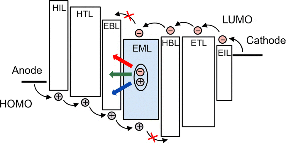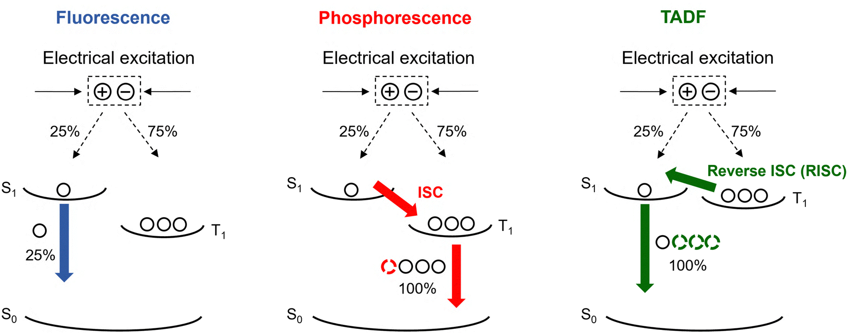 With an equal importance, the device fabrication method can significantly affect the efficiency, operational stability, and production cost of OLEDs. Broadly, OLEDs can be classified into two types, vacuum-deposited and solution-processed, depending on whether the EML is formed via thermal evaporation or solution-processed techniques. Vacuum deposition offers precise control over film thickness and uniformity and readily enables the formation of complex multilayer architectures, thereby delivering the record efficiencies in many state-of-the-art TADF OLEDs. However, it suffers from high operational costs, poor material utilization, and device size limitations imposed by the vacuum chamber, all of which hinder scalability to large-area manufacturing. In contrast, solution-processed TADF OLEDs represent a promising alternative, as they dispense with high-vacuum conditions and deposition chambers, enabling low-cost, scalable fabrication. Nevertheless, they typically exhibit lower efficiency and more pronounced efficiency roll-off than vacuum-deposited counterparts. Multiple functional layers are required to balance charge injection and transport, thereby fully exploiting the emitters’ potential, but the scarcity of mutually orthogonal solvent systems makes such multilayer stacks difficult to fabricate. As a result, solution-processed OLEDs tend to employ simplified architectures, introducing injection barriers and carrier-mobility mismatches that foster charge accumulation and enhance nonradiative loss channels, thus stronger efficiency roll-off. In addition, achieving uniform, defect-free layers and interfaces by the solution process is challenging because solute precipitation, recrystallization, and aggregation readily occur during film formation, promoting interfacial charge accumulation and annihilation that degrade efficiency and operational stability. To overcome these limitations, efforts span molecular and device engineering. Molecular engineering of solution-processable TADF emitters focuses on (i) minimizing the singlet–triplet energy gap (ΔEST) to accelerate RISC while retaining high oscillator strength for high photoluminescence quantum yield (PLQY); (ii) enhancing spin–orbit coupling (SOC) to boost RISC and suppress efficiency roll-off at the high-brightness region; (iii) increasing rigidity (spiro/bridged/locked torsions) to reduce nonradiative loss; (iv) adopting bulky substituents and alkyl/dendritic groups to suppress aggregation and improve solubility. Device engineering includes (i) optimizing the hole injection layer (HIL), hole transport layer (HTL), and electron transport layer (ETL) for balanced charge injection and transport, as well as exciton confinement; (ii) selecting high-T1, high-mobility hosts (small-molecule, dendrimeric, or polymer hosts), mixed-host and interfacial exciplex systems to improve charge balance; and (iii) adopting TADF-sensitized (hyperfluorescence) architectures to maximize exciton utilization and reduce efficiency roll-off. In what follows, we place emphasis on solution-processable emitters, complemented by research on device engineering aimed at improving their performance.