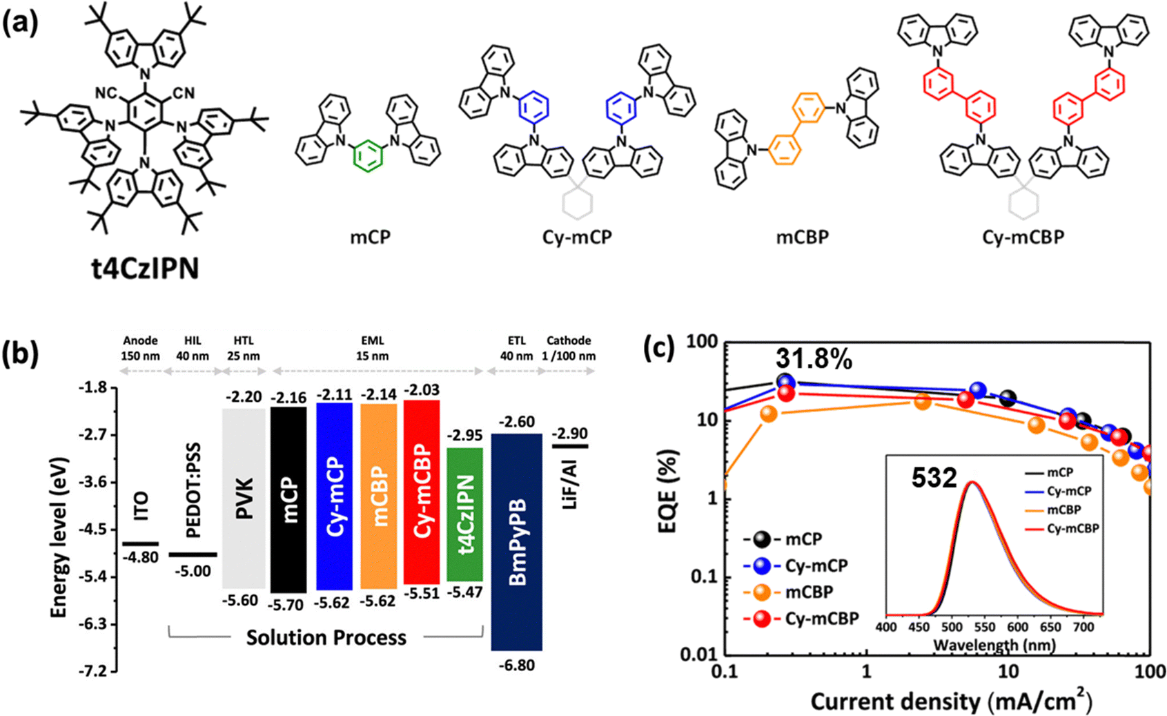 4CzIPN has served as a benchmark green TADF emitter, and numerous groups have optimized device architectures to maximize its solution-processed device performance. Inserting a self-organized buffer HIL between ITO and the EML increases the hole-injection capability and blocks the exciton quenching at the HIL/EML interface, delivering an EQEMAX of 24%.11 Yang and co-workers doped InCl3 into PEDOT:PSS layer, enhancing hole injection and also achieving an EQEMAX of 24%.12 Jou and co-workers developed a series of HTMs, possessing high hole mobility, well-aligned HOMO/LUMO energy levels, and adequately high T1 energy, thus enabling comparable or even superior device performance to the conventional HTMs.13 Lee and co-workers introduced tert-butyl groups into 4CzIPN, yielding t4CzIPN. It shows enhanced solubility and improved film morphology, thereby reaching a high EQEMAX of 18.3%.14 Choi and co-workers reported several novel host materials, including mCPDPO,15 APC,16 Py2Cz, Py2BFCz, and Py2ICz,17 CzPy2TCz and CzPy3TCz,18 BBCzC, BTDC, BCzTC,19 Cy-mCP, and Cy-mCBP,20 along with a polymer/small molecule exciplex system,21 markedly boosting the performance of t4CzIPN in solution-processed OLEDs with an EQEMAX of 18.8–31.8% (Fig. 3). The elevated efficiencies are chiefly attributable to the emitter's high PLQY and the excellent balance of hole and electron transport in the EML. They also developed a novel HTM, PmCP, featuring a high T1 and superior hole mobility in comparison to the conventional HTM poly(N-vinylcarbazole) (PVK). Incorporating PmCP into a t4CzIPN-based, solution-processed OLED achieved a high EQEMAX of 29.6%, surpassing the 21.1% in the PVK-based device.22