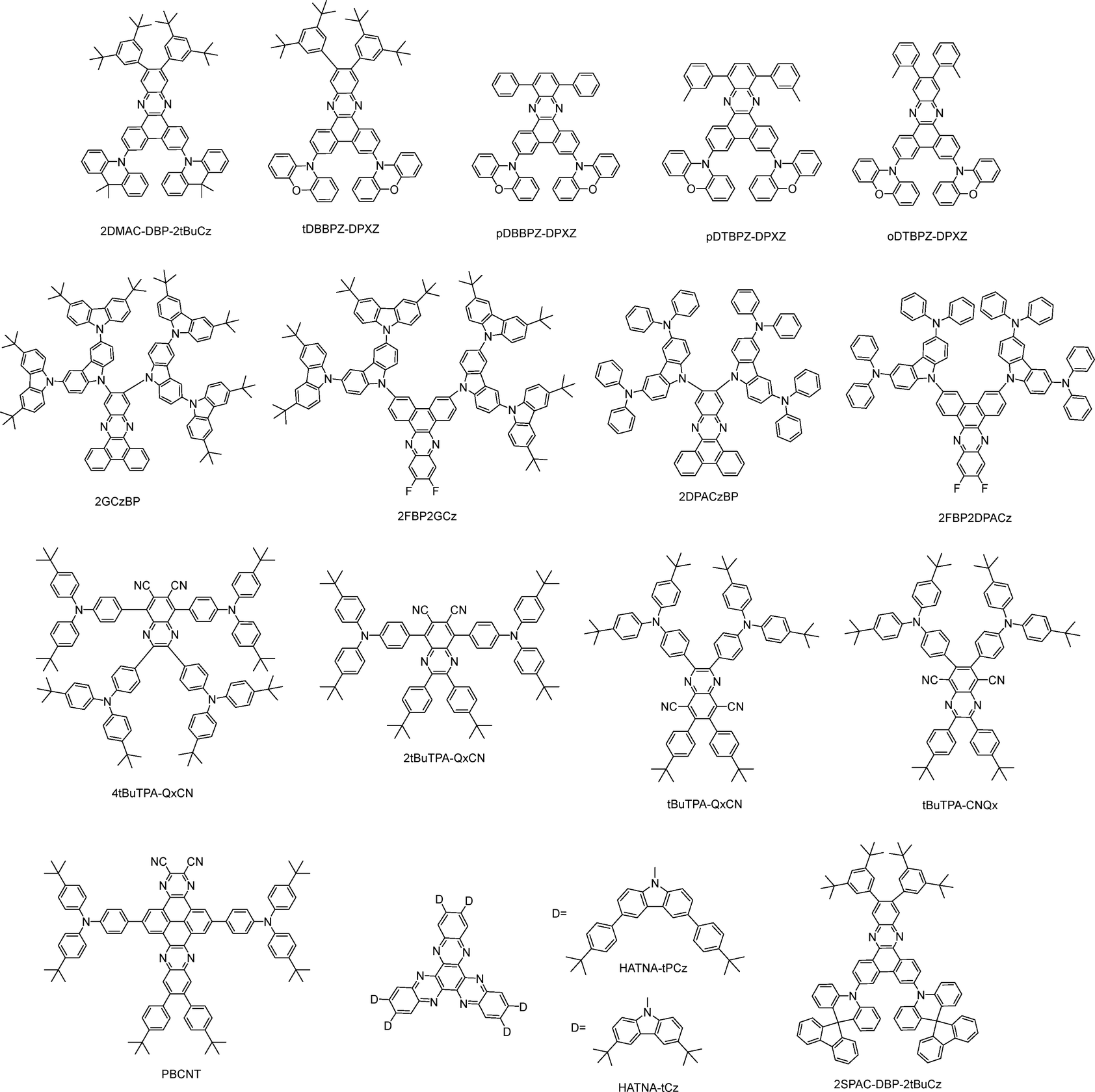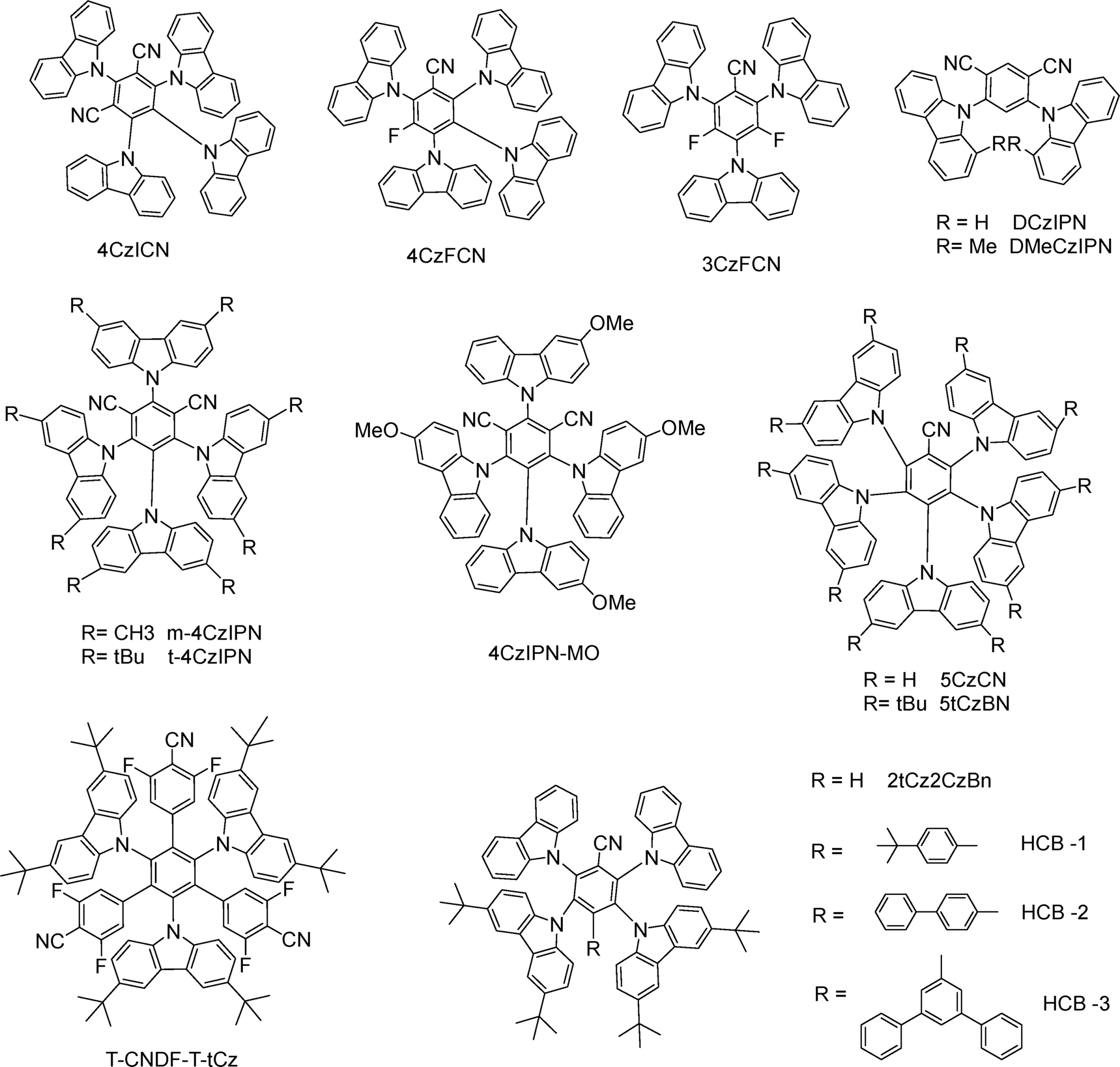000 = 19.6%/12.7%) in its solution-processed OLED.37 All the aforementioned molecules are summarized in Fig. 4. In summary, adjusting the type, number, and position of substituents on CzCN derivatives, together with optimal device-engineering tactics, enables their solution-processed OLEDs with exceptional performance: an EQEMAX of 25.8% for the non-doped one and EQEMAX of 31.8% for the doped case.