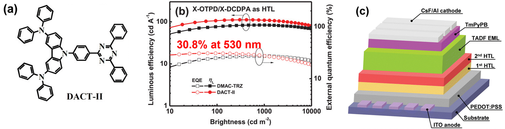 000 cd m−2. The same strategy applied to DACT-II delivers green EL at 530 nm with an EQEMAX of 30.8% and an LMAX of 81