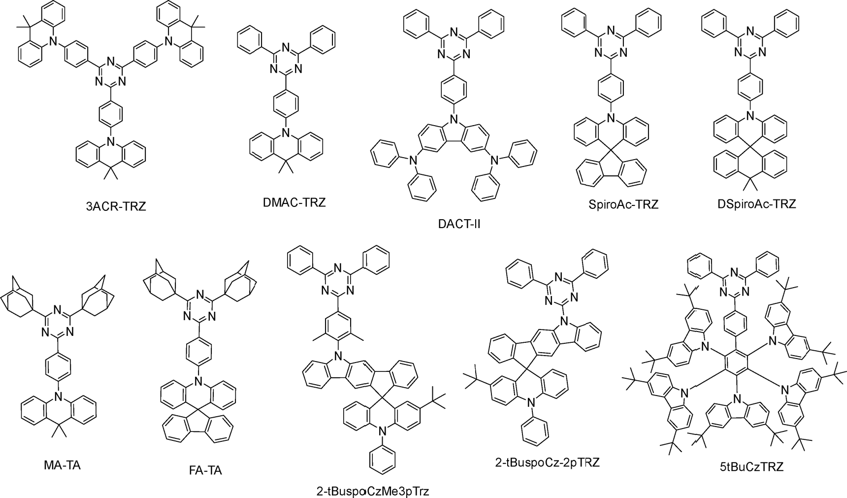 100 cd m−2 (Fig. 5).41 Wang and co-workers reported two hybridized local and charge-transfer emitters, 2-tBuspoCz-2pTrz and 2-tBuspoCzMe3pTrz, that generate exciplex-type TADF systems when paired with TAPC. Such exciplex systems exhibit green EL at 518 nm and 520 nm, with EQEMAX values of 10.1% and 16.6%, respectively. Doping into these systems, BN5 shows a high EQEMAX of 22.1% and narrow green EL at 504 nm.42 SpiroAC-TRZ, with its rigid spiro-donor scaffold and optimized D–A architecture, has been implemented as a TADF emitter in solution-processed OLEDs. Wang and co-workers developed adamantane-cored and cyclohexane-cored dendritic host materials, Ad-4D243 and CH-2D2.44 Paring with these hosts, spiroAC-TRZ achieved a high EQEMAX of 18.3% and 17.8% with blue EL at 482 nm and 476 nm, respectively. Zhao and co-workers incorporated PVK into the EML to modulate interfacial carrier transport and improve film morphology. A ternary blend of 15 wt% spiroAC-TRZ: 10 wt% PVK: mCBP provides an impressive EQEMAX of 25.1%.45 DspiroAc-TRZ displays an high EQEMAX of 26.8% in the doped solution-processed OLED.46 Liao and co-workers developed two through-space charge-transfer TADF emitters, 2tDMG and 3tDMG. In solution-processed OLEDs, 2tDMG exhibits blue EL at 486 nm with an EQEMAX of 16.2%. 3tDMG exhibits enhanced solubility and processability due to tert-butyl units, thus achieving a higher EQEMAX of 20.2% and green EL at 504 nm.47 Kaji and co-workers replaced the two phenyl substituents on the triazine core of DMAC-TRZ with adamantyl groups, affording MA-TA. This change weakens the acceptor and suppresses non-radiative decay, leading to a high PLQY of ∼99% and thus a high EQEMAX of 22.1%.48