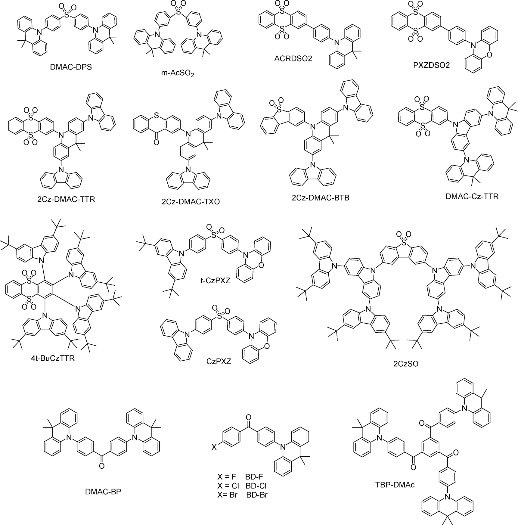 Another important class of TADF materials are developed using carbonyl groups as electron acceptors. DMAC-BP, a representative green TADF emitter, achieves an impressive EQEMAX of 18.9%, with a high EQE1000 of 18.0% and an LMAX of ≈50